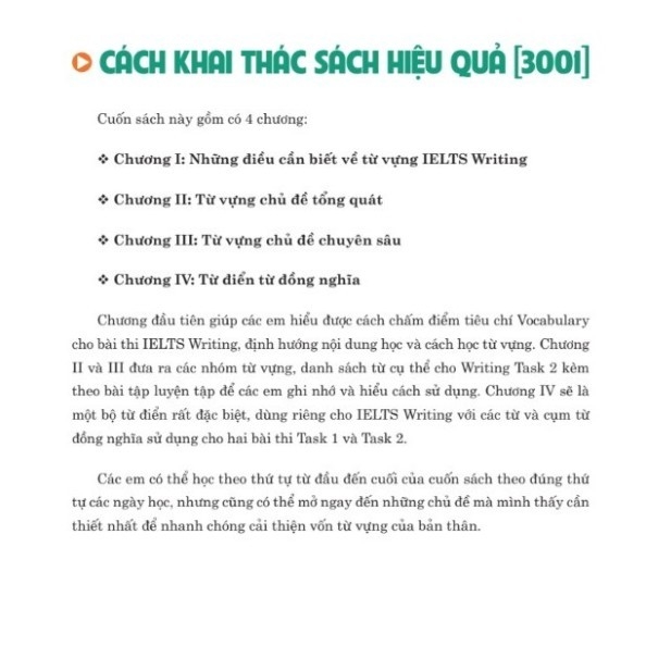 1. Sách từ vựng ielts - 30 ngày thành thạo từ vựng ielts writing Moonbook:- Thời gian biểu học hàng ngày- Từ vựng theo chủ đề- Từ điển từ đồng nghĩa, trái nghĩa- Phương pháp lọc - học - ôn khoa học2. Cuốn sách này gồm có 4 chương:- Chương I: Những điều cần biết về từ vựng IELTS Writing- Chương II: Từ vựng chủ đề tổng quát- Chương III: Từ vựng chủ đề chuyên sâu- Chương IV: Từ điển từ đồng nghĩaChương đầu tiên giúp các em hiểu được cách chấm điểm tiêu chí Vocabulary cho bài thi IELTS Writing, định hướng nội dung học và cách học từ vựng. Chương II và III đưa ra các nhóm từ vựng, danh sách từ cụ thể cho Writing Task 2 kèm theo bài tập luyện tập để các em ghi nhớ và hiểu cách sử dụng. Chương IV sẽ là một bộ từ điển rất đặc biệt, dùng riêng cho IELTS Writing với các từ và cụm từđồng nghĩa sử dụng cho hai bài thi Task 1 và Task 2.Các em có thể học theo thứ tự từ đầu đến cuối của cuốn sách theo đúng thứ tự các ngày học, nhưng cũng có thể mở ngay đến những chủ đề mà mình thấy cần thiết nhất để nhanh chóng cải thiện vốn từ vựng của bản thân.3. Thông tin chi tiết sách từ vựng ielts writing - 30 ngày thành thạo từ vựng ielts writing Moonbook:- Nhà xuất bản: Dân Trí- Số trang: 232- Tác giả: Thầy Xuân Phi- ID: 3000, HSD: 12 tháng kể từ ngày kích hoạt- #sach #ielts #tu #vung #writing #tieng #anh