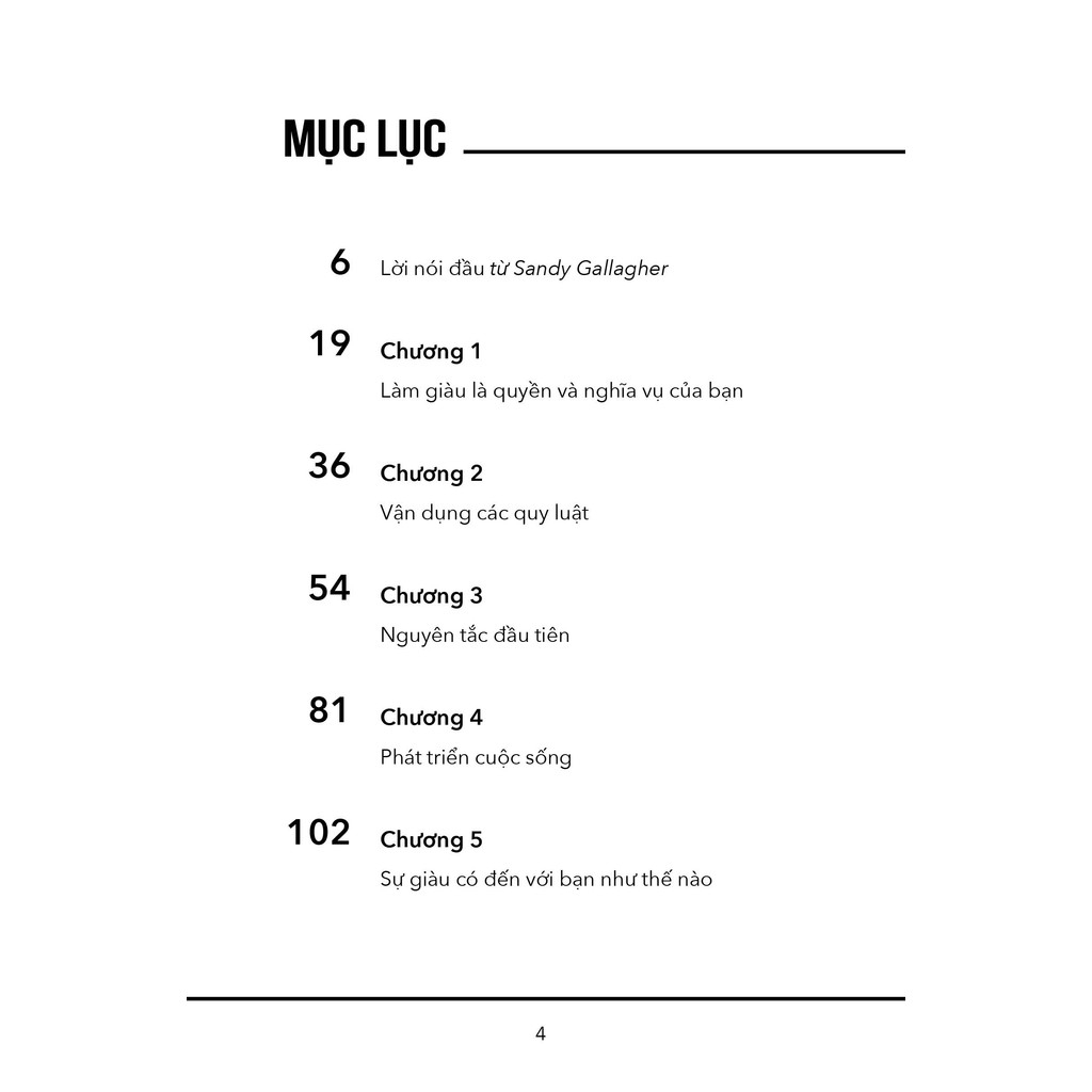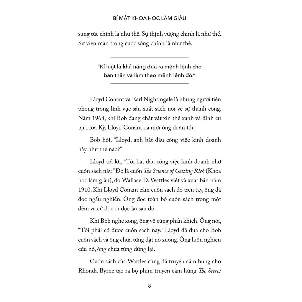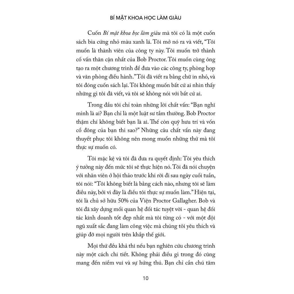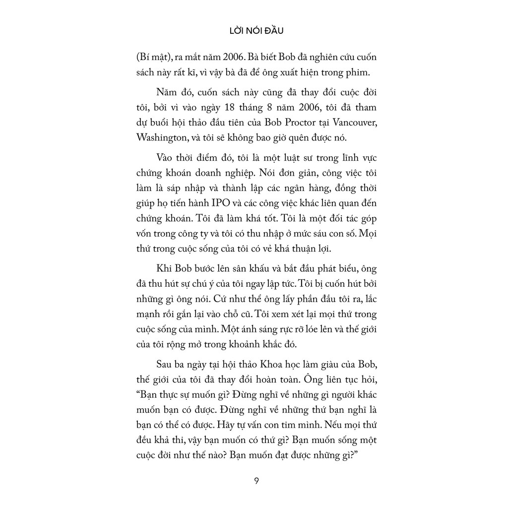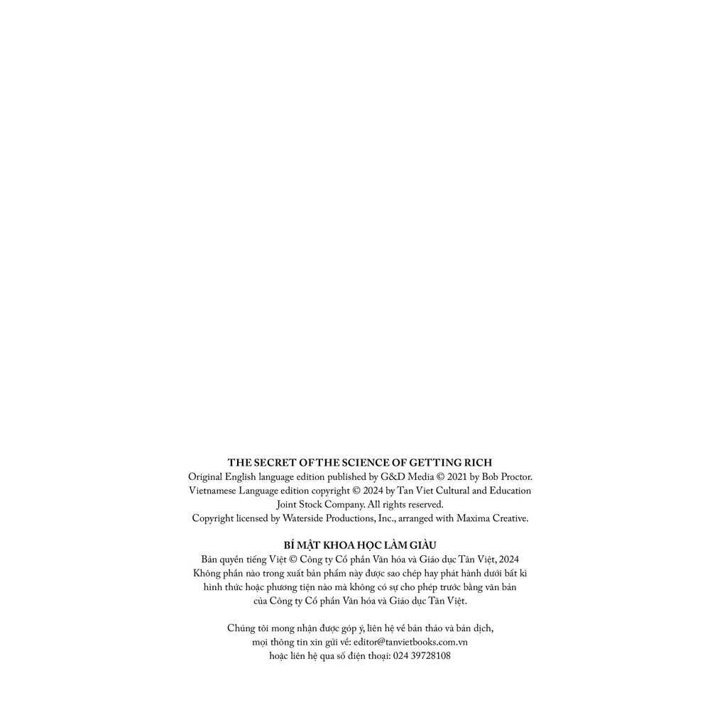 Tên sách: Bí mật khoa học làm giàuTác giả: Bob Proctor - Sandy GallagherSố trang: 180 trangKhổ: 13,5 x 20,5 cmGiá: 80.000đCode: 8935210310415Tân Việt Books liên kết với NXB Dân trí“Hãy bắt đầu nghĩ về sự sung túc. Một tâm trí kỉ luật có thể tạo ra nguồn thu nhậpđáng kể, bắt đầu từ hôm nay.” - Napoleon Hill. Nếu bạn nghiên cứu cuốn sách Bí mậtkhoa học làm giàu và rèn luyện tính kỉ luật trong học tập, suy nghĩ và hành động, bạn cóthể chuyển thu nhập hằng năm thành thu nhập hằng tháng, và có thể là nhiều hơn nữa.Cuốn sách này không phải là một mớ thông tin hỗn độn. Đó là một kế hoạch bàibản, khoa học, được cân nhắc kĩ lưỡng để mang đến sự sung túc cho mọi khía cạnh trongcuộc sống của bạn. Bob Proctor đã nghiên cứu về tâm trí, các mô thức, và các quy luậtphổ quát về tiền bạc trong hơn 57 năm. Không ai tốt hơn Bob để dạy bạn bí mật đằng saucuốn sách của Wallace Wattles, Khoa học làm giàu.Ông có thể khiến những khái niệm phức tạp nhất của tác phẩm kinh điển đó trởthành những điều đơn giản nhất. Và ông sẽ cung cấp nhiều cách thực tế để bạn có thể ápdụng các khái niệm này vào cuộc sống của mình - bắt đầu từ hôm nay. Nhưng trước tiên,bạn phải tin rằng bạn có thể thu hút bất cứ điều gì bạn muốn trong cuộc sống.Để hiểu rõ được cuốn sách này, bạn cần lưu ý:• Dành thời gian phát triển nhận thức và nghiên cứu nội dung cuốn sách này mỗingày.• Đưa ra quyết định về các ý tưởng một cách nhanh chóng và không nên đổi ý quánhiều lần (nếu cần thiết phải thay đổi).• Mở mang đầu óc và để các ý tưởng đi sâu vào tâm trí.• Hãy tự hỏi: Bạn muốn gì? Bạn thực sự muốn gì?Đừng phản bác bất cứ điều gì. Lắng nghe mọi thứ. Điều đó không có nghĩa là bạnphải chấp nhận nó. Hãy nghĩ về nó, xem xét nó và áp dụng những ý tưởng mà bạn nắmrõ. Tác giả đã chỉ ra rằng, với tình hình hiện tại, chúng ta thực sự muốn biết điều gì giúpbản thân phân định được cái tốt và cái xấu.Trên thực tế, chính suy nghĩ của bạn mới là thứ quyết định tốt xấu. Chúng ta cómột sự lựa chọn: có thể tập trung vào những điều tốt hoặc tập trung vào những điềukhông tốt. Tất cả bắt đầu với những quyết định do chúng ta đưa ra. Xuyên suốt cuốn sáchnày, bạn sẽ được yêu cầu đưa ra quyết định.Bạn sẽ tự hỏi bản thân, “Mình có muốn làm điều này không? Mình có muốn đầutư vào đó không? Mình có muốn theo đuổi mục tiêu đó không?” Những thông tin giúpbạn nâng cao nhận thức sẽ xuất hiện trong tâm trí bạn và chúng sẽ đến dồn dập.Một trong những điểm đáng ngưỡng mộ nhất ở tác giả của cuốn sách này là tính kỉluật. Kỉ luật là khả năng đưa ra mệnh lệnh cho bản thân và làm theo mệnh lệnh đó. Bạnmuốn bắt đầu nghĩ về sự sung túc, và bạn muốn rèn luyện tính kỉ luật khi nghiên cứunhững ý tưởng này. Bạn càng rèn luyện tính kỉ luật, bạn càng hiểu được nhiều điều từcuốn sách này. Sự sung túc chính là như thế. Sự thịnh vượng chính là như thế. Sự viênmãn trong cuộc sống chính là như thế.Chìa khóa để bạn có được cuộc sống mà mình mong muốn là nhận thức, và chúngta phải nỗ lực để phát triển nó. Sự thật là hầu hết mọi người sẽ không chịu nỗ lực. Nhưngnếu bạn nỗ lực, mỗi ngày, bạn dành thời gian để phát triển nhận thức và nghiên cứu tàiliệu mang lại những ý tưởng hay mà bạn có thể áp dụng vào cuộc sống thì bạn sẽ khôngbao giờ thua cuộc. Trên thực tế, bạn sẽ nhận được thành quả xứng đáng.Chúng ta thường mắc sai lầm khi dành cả cuộc đời và thời gian của mình chonhững hoạt động vô nghĩa - chỉ mang lại chút ít thỏa mãn và sự hoàn thành. Sự xuất sắckhông có gì bí ẩn cả. Đó là làm những việc nhỏ nhặt một cách xuất sắc mỗi ngày.- Bạn có mệt mỏi vì luôn mong ước và hi vọng có nhiều tiền hơn không?- Điều gì đang ngăn cản bạn kiếm được số tiền mà bạn thực sự muốn kiếm?- Bạn có muốn nhiều hơn từ cuộc sống nhưng lại không chắc đó là gì không?- Bạn có một mục tiêu cụ thể nhưng không biết làm thế nào để đạt được nó?- Điều gì khiến mọi người bị mắc kẹt năm này qua năm khác?- Khi nào và làm thế nào để việc kiếm tiền trở nên dễ dàng?Cuốn sách này sẽ cho bạn câu trả lời hoàn hảo cho tất cả những thắc mắc đó vàgiúp bạn thay đổi niềm tin về thành công và tiền bạc để tạo dựng cuộc sống mà bạn mongmuốn.