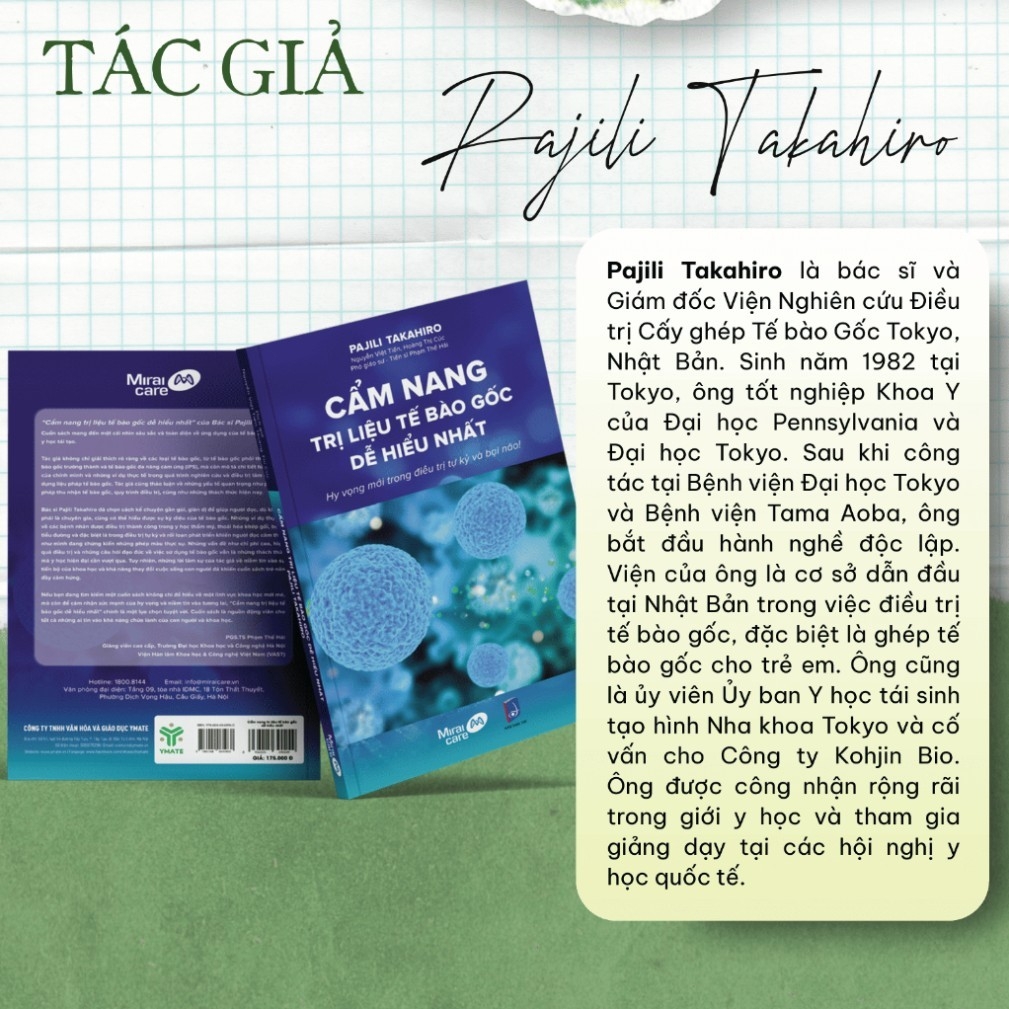 Bác sĩ Pajili Takahiro là chuyên gia hàng đầu trong lĩnh vực tế bào gốc, giám đốc Viện Nghiên cứu Cấy ghép Tế bào Gốc Tokyo, Nhật Bản. Ông đã tham gia vào nhiều nghiên cứu y học quốc tế và được công nhận bởi cộng đồng y khoa quốc tế. Cuốn sách này là kết quả của những năm tháng nghiên cứu và thực hành trong lĩnh vực tế bào gốc.