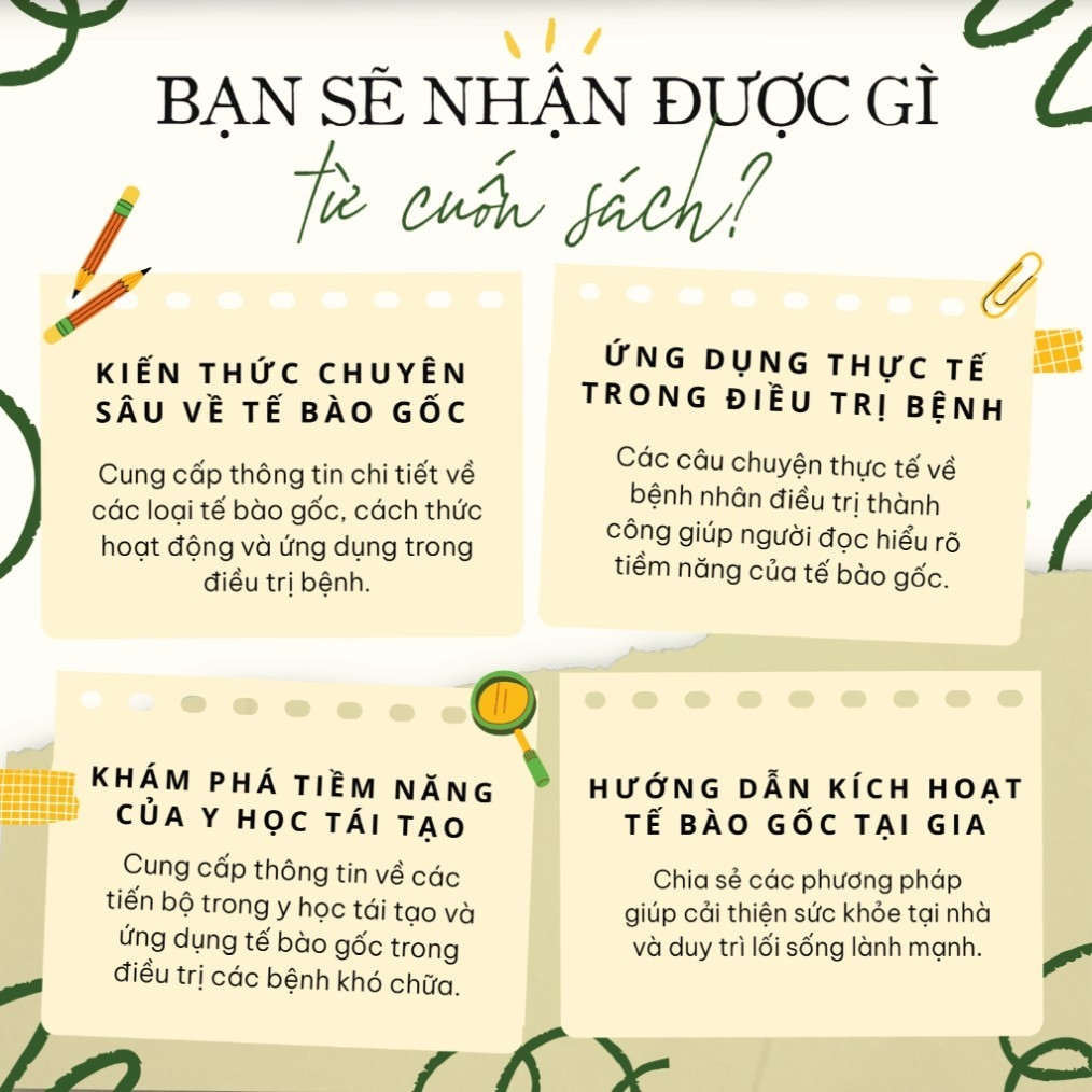 Cuốn sách không chỉ giải thích về các loại tế bào gốc mà còn đưa ra các ứng dụng thực tế trong điều trị, giúp độc giả hiểu rõ về tiềm năng chữa lành của tế bào gốc. Những câu chuyện thực tế về bệnh nhân được điều trị thành công sẽ giúp bạn cảm nhận rõ hơn về hiệu quả của liệu pháp này. Cuốn sách cũng làm rõ các thách thức như chi phí điều trị, đạo đức y học và các tiêu chuẩn khoa học cần được tuân thủ.