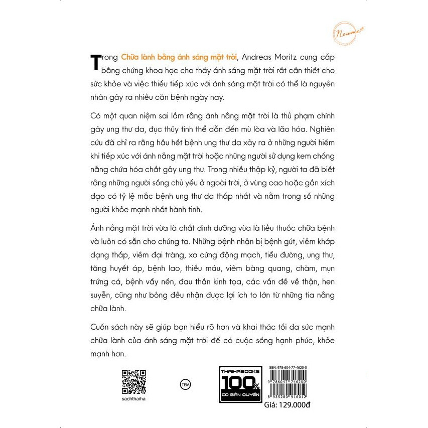 Tên sách: Chữa lành bằng ánh sáng mặt trờiTác giả: Andreas MoritzGiá: 129.000đSố trang: 300 trangNhà xuất bản: Thế GiớiKhổ: 14.5 x 20.5 cmBarcode: 8935280916012 ISBN: 978-604-77-46200CHỮA LÀNH BẰNG ÁNH SÁNG MẶT TRỜIAndreas MoritzTrong Chữa lành bằng ánh sáng mặt trời, Andreas Moritz cung cấp bằng chứng khoa học cho thấy ánh sáng mặt trời rất cần thiết cho sức khỏe và việc thiếu tiếp xúc với ánh sáng mặt trời có thể là nguyên nhân gây ra nhiều căn bệnh ngày nay. Có một quan niệm sai lầm rằng ánh nắng mặt trời là thủ phạm chính gây ung thư da, đục thủy tinh thể dẫn đến mù lòa và lão hóa. Nghiên cứu đã chỉ ra rằng hầu hết bệnh ung thư da xảy ra ở những người hiếm khi tiếp xúc với ánh nắng mặt trời hoặc những người sử dụng kem chống nắng chứa hóa chất gây ung thư. Trong nhiều thập kỷ, người ta đã biết rằng những người sống chủ yếu ở ngoài trời, ở vùng cao hoặc gần xích đạo có tỷ lệ mắc bệnh ung thư da thấp nhất và nằm trong số những người khỏe mạnh nhất hành tinh. Ánh nắng mặt trời vừa làchất dinh dưỡng vừa là liều thuốc chữa bệnh và luôn có sẵn cho chúng ta. Những bệnh nhân bị bệnh gút, viêm khớp dạng thấp, viêm đại tràng, xơ cứng động mạch,tiểu đường, ung thư, tăng huyết áp, bệnh lao, thiếu máu, viêm bàng quang, chàm,mụn trứng cá, bệnh vẩy nến, đau thần kinh tọa, các vấn đề về thận, hen suyễn, cũng như bỏng đều nhận được lợi ích to lớn từ những tia nắng chữa lành. Cuốn sách này sẽ giúp bạn hiểu rõ hơn và khai thác tối đa sức mạnh chữa lành của ánh sáng mặt trời để có cuộc sống hạnh phúc, khỏe mạnh hơn.Trích đoạn sách hay:Không giống như thuốc, phẫu thuật hay xạ trị, ánh sáng mặt trời không tốn kém gì, không có tác dụng phụ có hại và trên hết, nó khiến bạn cảm thấy dễ chịu. (Trang 182) Các bác sĩ giờ đây đã thẳng thắn thừa nhận rằng đã đến lúc chúng ta cho phép mình được tận hưởng và nhận nhiều lợi ích thay vì trốn tránh ánh nắng mặt trời. (Trang 64) Tiếp xúc thường xuyên với ánh sáng mặt trời dường như vẫn là một trong những biện pháp tốt nhất mà người ta có thể thực hiện để ngăn ngừa ung thư, bao gồm cả ung thư da. (Trang 62) Động vật nuôi nhốt trong chuồng kín sẽ tăng trọng nhanh hơn, và con người thiếu nắng cũng như vậy. Do đó, nếu bạn muốn giảm cân hoặc tăng cơ săn chắc, hãy tắm nắng thường xuyên. Bất kỳ ai bị thiếu nắng đều gặp các vấn đề về sức khỏe, cả tinh thần lẫn thể chất. Năng lượng thiết yếu của cơ thể sẽ giảm dần theo thời gian và biểu hiện rõ thông qua chất lượng cuộc sống. Dân số ởcác nước Bắc Âu như Na Uy và Phần Lan, những nơi trải qua nhiều tháng mùa đông âm u mỗi năm, có tỷ lệ cáu kỉnh, mệt mỏi, bệnh tật, mất ngủ, trầm cảm, nghiện rượu và tự tử cao hơn so với những người sống ở những nơi đầy nắng trên thế giới. Tỷ lệ ung thư da ở những nước này cũng cao hơn. Ví dụ, tỷ lệ mắc khối u ác tính (ung thư da) ở quần đảo Orkney và Shetland, phía bắc Scotland, cao gấp 10 lần so với các đảo ở Địa Trung Hải. (Trang 29)Công ty Cổ phần Sách Thái Hà trân trọng giới thiệu!