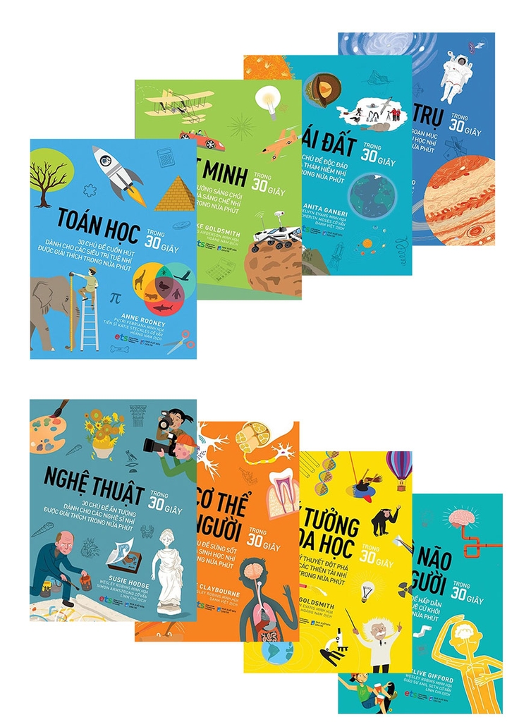7.Ý tưởng khoa học trong 30 giây (TS. Mike Goldsmith): Ngày nay, khoa học đang định hình thế giới. Quần áo, đồ ăn, nhà cửa hay cả chiếc ti-vi mà ta xem hằng ngày đều có được nhờ khoa học. Khoa học cũng giúp cơ thể khoẻ mạnh, và nhờ khoa học mà chúng ta hiểu được rất nhiều điều về Vũ trụ bao la. Từ buổi bình minh, khoa học đã liên tục phát triển từ các ý tưởng sáng chói. 30 ý tưởng quan trọng sẽ được giải thích trong cuốn sách này.