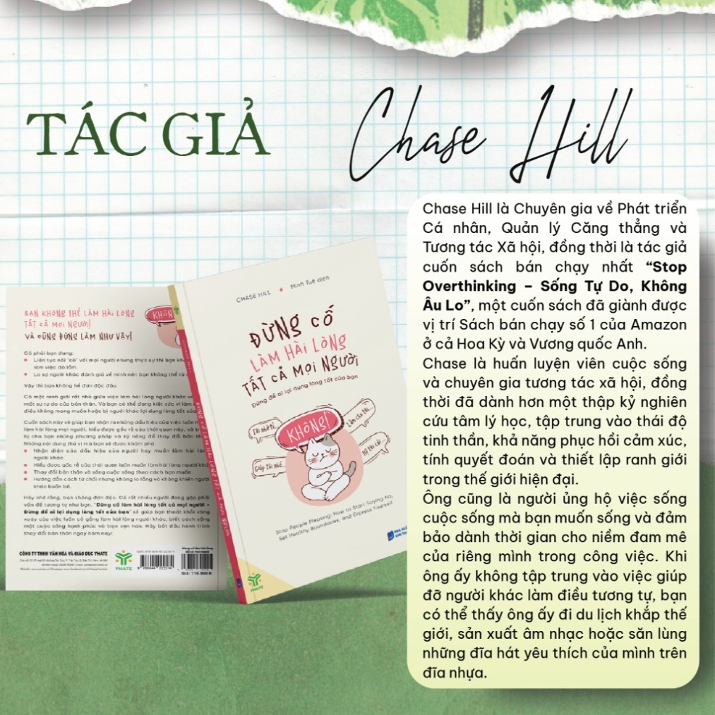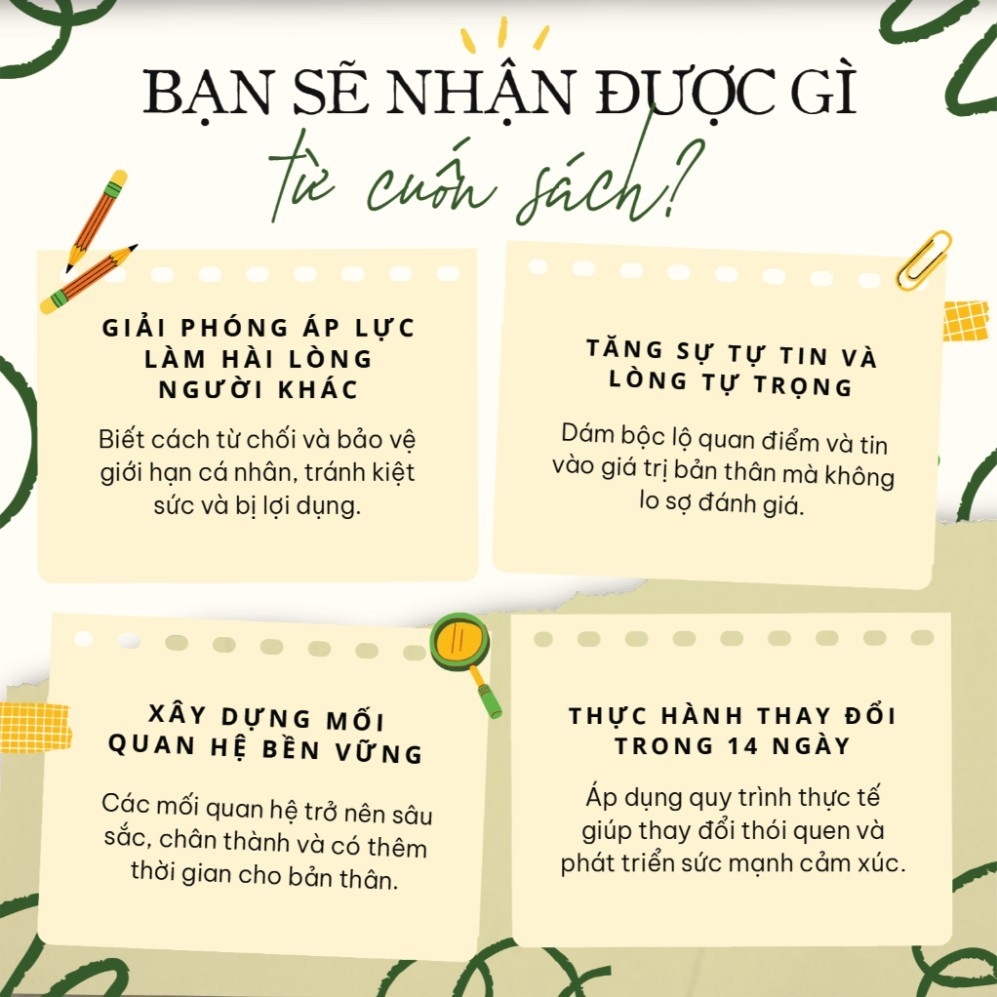 Đừng Cố Làm Hài Lòng Tất Cả Mọi Người: Bí Quyết Sống Tự Do và Hạnh PhúcBạn có thường xuyên cảm thấy bản thân luôn phải cố gắng làm hài lòng tất cả mọi người? Bạn luôn đặt nhu cầu của người khác lên trên bản thân, dù điều đó khiến bạn cảm thấy mệt mỏi và bực bội? Nếu vậy, cuốn sách "Đừng Cố Làm Hài Lòng Tất Cả Mọi Người" chính là dành cho bạn.Cuốn sách này là cẩm nang hữu ích giúp bạn giải phóng bản thân khỏi gánh nặng làm hài lòng người khác, từ đó hướng đến cuộc sống tự do và hạnh phúc hơn. Tác giả sẽ vạch trần những tác hại tiềm ẩn của việc luôn cố gắng làm hài lòng mọi người, đồng thời cung cấp cho bạn những chiến lược thiết thực để thay đổi tư duy và hành vi của bản thân.Dưới đây là một số điểm chính mà bạn sẽ học được từ cuốn sách: - Tại sao chúng ta lại có xu hướng muốn làm hài lòng người khác? - Tác hại của việc luôn cố gắng làm hài lòng mọi người: ảnh hưởng đến sức khỏe tinh thần, các mối quan hệ và sự phát triển bản thân. - Cách xác định xem bạn có đang cố gắng làm hài lòng người khác quá mức hay không. - Chiến lược để thay đổi tư duy và hành vi: đặt ra ranh giới, học cách nói "không", đối phó với sự phản ứng tiêu cực của người khác, v.v. - Kỹ năng giao tiếp hiệu quả: cách để thể hiện bản thân một cách rõ ràng và tự tin, đồng thời xây dựng các mối quan hệ lành mạnh. - Kế hoạch hành động 14 ngày: giúp bạn áp dụng những bài học từ sách vào thực tế một cách dễ dàng.Cuốn sách này phù hợp với: - Những người trẻ tuổi đang gặp khó khăn trong việc khẳng định bản thân và đặt ra ranh giới. - Những người luôn cảm thấy mệt mỏi và bực bội vì phải cố gắng làm hài lòng người khác. - Những người muốn cải thiện các mối quan hệ và nâng cao chất lượng cuộc sống. - Nếu bạn đang tìm kiếm một cuốn sách có thể giúp bạn thay đổi cuộc sống, "Đừng Cố Làm Hài Lòng Tất Cả Mọi Người" là lựa chọn hoàn hảo dành cho bạn.Ngoài ra, cuốn sách này còn có một số ưu điểm khác: - Nội dung được trình bày một cách khoa học, logic và dễ hiểu. - Sử dụng nhiều ví dụ thực tế để minh họa cho các bài học. - Giọng văn nhẹ nhàng, truyền cảm hứng. Nhìn chung, "Đừng Cố Làm Hài Lòng Tất Cả Mọi Người" là một cuốn sách giá trị với nhiều thông tin hữu ích. Cuốn sách này có thể giúp bạn giải phóng bản thân khỏi những gánh nặng không cần thiết, từ đó hướng đến cuộc sống tự do và hạnh phúc hơn.