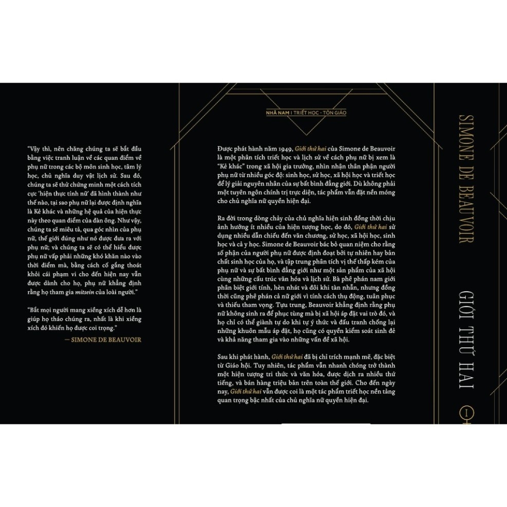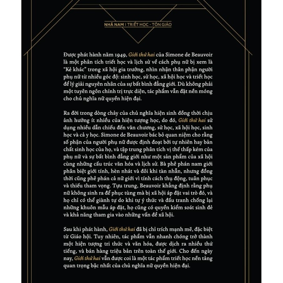 Nhà phát hành: Nhã NamNhà xuất bản: Tổng hợp Thành phố Hồ Chí MinhTác giả: Simone De BeauvoirDịch giả: Bảo Chân - Như PhongSố trang: 428Kích thước: 15.5 x 24 cmLoại bìa: Bìa cứng, Bìa áoĐược phát hành năm 1949, Giới thứ hai của Simone de Beauvoir là một phân tích triết học và lịch sử về cách phụ nữ bị xem là “Kẻ khác” trong xã hội gia trưởng, nhìn nhận thân phận người phụ nữ từ nhiều góc độ: sinh học, sử học, xã hội học và triết học để lý giải nguyên nhân của sự bất bình đẳng giới. Dù không phải một tuyên ngôn chính trị trực diện, tác phẩm vẫn đặt nền móng cho chủ nghĩa nữ quyền hiện đại.Ra đời trong dòng chảy của chủ nghĩa hiện sinh đồng thời chịu ảnh hưởng ít nhiều của hiện tượng học, do đó, Giới thứ hai sử dụng nhiều dẫn chiếu đến văn chương, sử học, xã hội học, sinh học và cả y học. Simone de Beauvoir bác bỏ quan niệm cho rằng số phận của người phụ nữ được định đoạt bởi tự nhiên hay bản chất sinh học của họ, và tập trung phân tích vị thế thấp kém của phụ nữ và sự bất bình đẳng giới như một sản phẩm của xã hội cùng những cấu trúc văn hóa và lịch sử. Bà phê phán nam giới phân biệt giới tính, hèn nhát và đôi khi tàn nhẫn, nhưng đồng thời cũng phê phán cả nữ giới vì tính cách thụ động, tuân phục và thiếu tham vọng. Tựu trung, Beauvoir khẳng định rằng phụ nữ không sinh ra để phục tùng mà bị xã hội áp đặt vai trò đó, và họ chỉ có thể giành tự do khi tự ý thức và đấu tranh chống lại những khuôn mẫu áp đặt, họ cũng có quyền kiểm soát sinh đẻ và khả năng tham gia vào những vấn đề xã hội.Sau khi phát hành, Giới thứ hai đã bị chỉ trích mạnh mẽ, đặc biệt từ Giáo hội. Tuy nhiên, tác phẩm vẫn nhanh chóng trở thành một hiện tượng tri thức và văn hóa, được dịch ra nhiều thứ tiếng, và bán hàng triệu bản trên toàn thế giới. Cho đến ngày nay, Giới thứ hai vẫn được coi là một tác phẩm triết học nền tảng quan trọng bậc nhất của chủ nghĩa nữ quyền hiện đại.
