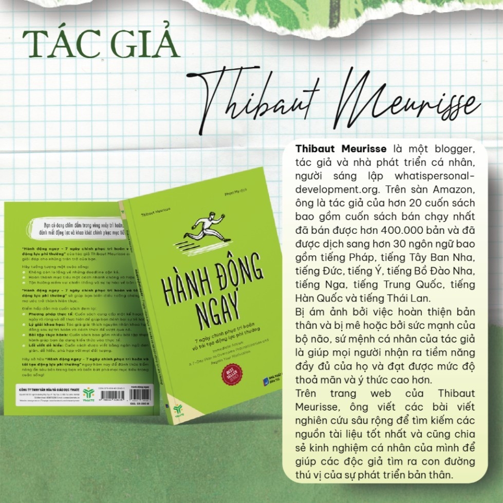 Cuốn sách “Hành động ngay - 7 ngày chinh phục trì hoãn và tái tạo động lực phi thường” là tập thứ hai trong bộ sách “Hiệu suất” của Thibaut Meurisse. Cuốn sách này tập trung vào việc giúp bạn vượt qua sự trì hoãn và lấy lại động lực để hoàn thành mục tiêu của mình. Cuốn sách sẽ giúp cho bạn:Không còn lo lắng về những deadline cận kề.Hoàn thành mục tiêu một cách nhanh chóng và hiệu quả. Tận hưởng niềm vui chiến thắng và sự tự hào về bản thân. Điểm độc đáo tạo nên sức hút của cuốn sách:1. Kế hoạch 7 ngày “cứu trợ” cho những ai vội vãCuốn sách mang đến một kế hoạch rõ ràng, chi tiết, dễ thực hiện trong vòng 7 ngày, giúp bạn từng bước thoát khỏi “vũng lầy” trì hoãn. Mỗi ngày là một bài học, một thử thách mới mẻ, dẫn dắt bạn tiến gần hơn đến mục tiêu chinh phục sự chủ động trong công việc và cuộc sống.2. Giải thích khoa học, dễ hiểuCuốn sách không chỉ dừng lại ở lời khuyên hay mệnh lệnh suông, mà còn đi sâu vào lý giải nguyên nhân gốc rễ của sự trì hoãn dưới góc nhìn khoa học. Nhờ đó, bạn hiểu rõ bản thân, nhận thức được những “cạm bẫy” tâm lý và có chiến lược phù hợp để vượt qua.3. Có các bài tập ứng dụng - soi chiếu sự tiến bộKhông hề có lý thuyết suông, cuốn sách cung cấp hàng loạt bài tập thực hành đan xen trong toàn bộ các chương. Những bài tập này đóng vai trò như “gương soi” giúp bạn nhìn nhận sự tiến bộ, đánh giá hiệu quả và điều chỉnh chiến lược phù hợp.4. Lối viết giản dị, gần gũi, khơi gợi hứng thúTác giả sử dụng ngôn ngữ đơn giản, dễ hiểu, kết hợp với những ví dụ thực tế, sinh động, tạo nên sự gần gũi và khơi gợi hứng thú cho người đọc. Đây không chỉ là sách, mà còn là người bạn đồng hành, truyền cảm hứng và động lực cho bạn trên hành trình chinh phục mục tiêu.“Hành động ngay - 7 ngày chinh phục trì hoãn và tái tạo động lực phi thường” không hứa hẹn điều kỳ diệu, nhưng sẽ cung cấp cho bạn “công cụ” thiết thực để chiến thắng bản thân, chinh phục mục tiêu và hướng đến một cuộc sống thành công, viên mãn.Đừng để trì hoãn đánh cắp tương lai của bạn! Hãy hành động ngay!