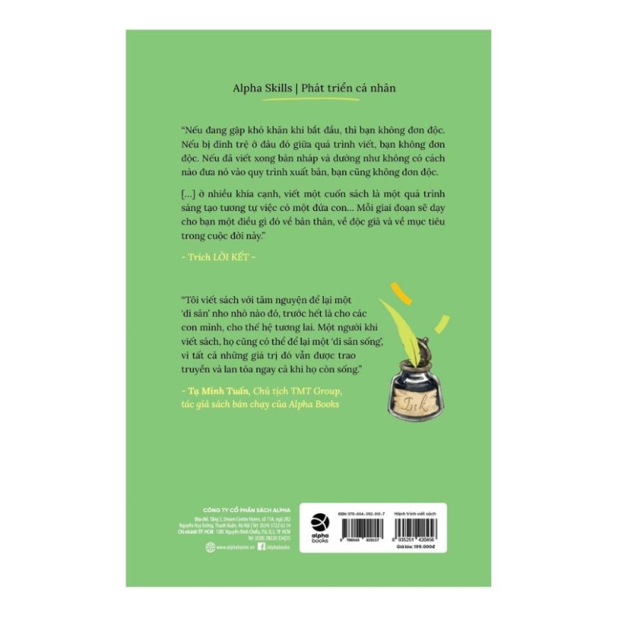 Công ty phát hành: Alpha BooksTác giả: Kelly NotarasKích thước: 16x24 cmSố trang: 300Hình thức: Bìa mềm, tay gấpNXB: NXB Thế GiớiNăm XB: 2023Tất tần tật bí kíp tạo nên một cuốn sách hoàn thiện từ một biên tập viên có hơn 20 năm kinh nghiệm làm việc với các tác giả thuộc mọi thành phần trong xã hội.“Tôi biết trong tôi có cả một cuốn sách.”“Tôi luôn luôn mong muốn trở thành tác gia.”“Mọi người đều hỏi khi nào tôi mới bắt tay vào viết sách.”“Tôi đã có cốt truyện rồi, nhưng có vẻ chẳng bao giờ tôi có thời gian mà viết.”Đây chỉ là vài lời chia sẻ mà Kelly Notaras nghe hằng ngày từ những tác-giả-tương-lai ở khắp nơi trên thế giới. Những chuyên gia lâu năm với kinh nghiệm đầy mình muốn chia sẻ những bài học kiến thức hữu ích cho cộng đồng, những anh hùng đời thường vượt qua nghịch cảnh và muốn truyền cảm hứng cho người khác hay đơn giản hơn là những cá nhân muốn để lại tác phẩm cuộc đời của chính mình... Trong thế giới biến động ngày nay, chúng ta luôn cần những “tiếng nói”, những câu chuyện như vậy. Hơn thế nữa, việc xuất bản sách chưa bao giờ đơn giản, dễ thực hiện hay có chi phí hợp lý. Đây cũng là lý do tại sao vẫn còn rất nhiều nhà lãnh đạo, những người chữa lành và những người yêu thích viết lách còn mắc kẹt ở vạch xuất phát.Cuốn sách này sẽ chính là “ngọn đèn” soi tỏ đường bước cho họ, một con đường đơn giản với từng bước đi cụ thể giúp các “cây bút” biến ý tưởng thành tác phẩm hoàn chỉnh.Kelly Notaras, với kinh nghiệm dày dặn trong ngành xuất bản, đã trình bày rõ ràng quy trình xuất bản sách, cung cấp cho những người muốn trở thành một tác giả bộ công cụ và những thông tin nội ngành cũng như truyền cảm hứng để những cá nhân đam mê viết lách có thể mạnh dạn bắt đầu, kiên trì đi hết hành trình và về đích nhanh nhất có thể.- PHẦN I: TRƯỚC KHI BẠN BẮT ĐẦU VIẾT - hướng dẫn bạn thiết lập ý định rõ ràng cho dự án, xây dựng phần mở đầu và dàn ý cho mỗi chương phần đủ "cứng cáp".- PHẦN II: QUÁ TRÌNH VIẾT LÁCH - khi bạn đã sẵn sàng cầm bút lên và viết, Kelly sẽ chia sẻ các bí kíp và mẹo nhỏ cô thu nhặt được trong hơn hai thập niên đồng hành với các tác giả.- PHẦN III: CON ĐƯỜNG XUẤT BẢN - hay hành trình từ "người viết bản thảo" đến "tác giả sách", gồm hai nội dung lớn là xây dựng cộng đồng độc giả tiềm năng và lựa chọn phương thức xuất bản (truyền thống hay tự thân?).ĐÁNH GIÁ/ NHẬN XÉT:“Hai cách tốt nhất để thay đổi thế giới là sinh con và viết sách. Tôi không thể giúp bạn với điều thứ nhất, nhưng nếu bạn muốn thực hiện điều thứ hai, hãy bắt đầu bằng cách đọc tác phẩm tuyệt vời của bậc thầy biên tập Kelly Notaras, Hành trình viết sách. Cuốn sách là nguồn tài nguyên tối ưu cho tất cả những ai muốn truyền đạt sự hiểu biết của mình với thế giới một cách sâu sắc và lâu dài.”— Scott Hoffman, đối tác sáng lập của Folio Literary Management, LLC, và đại diện cho nhiều tác giả có sách bán chạy số 1 của New York Times“Kelly Notaras là cố vấn tốt nhất mà bạn có thể có nếu bạn đang ấp ủ một cuốn sách. Với kiến văn sâu rộng của m