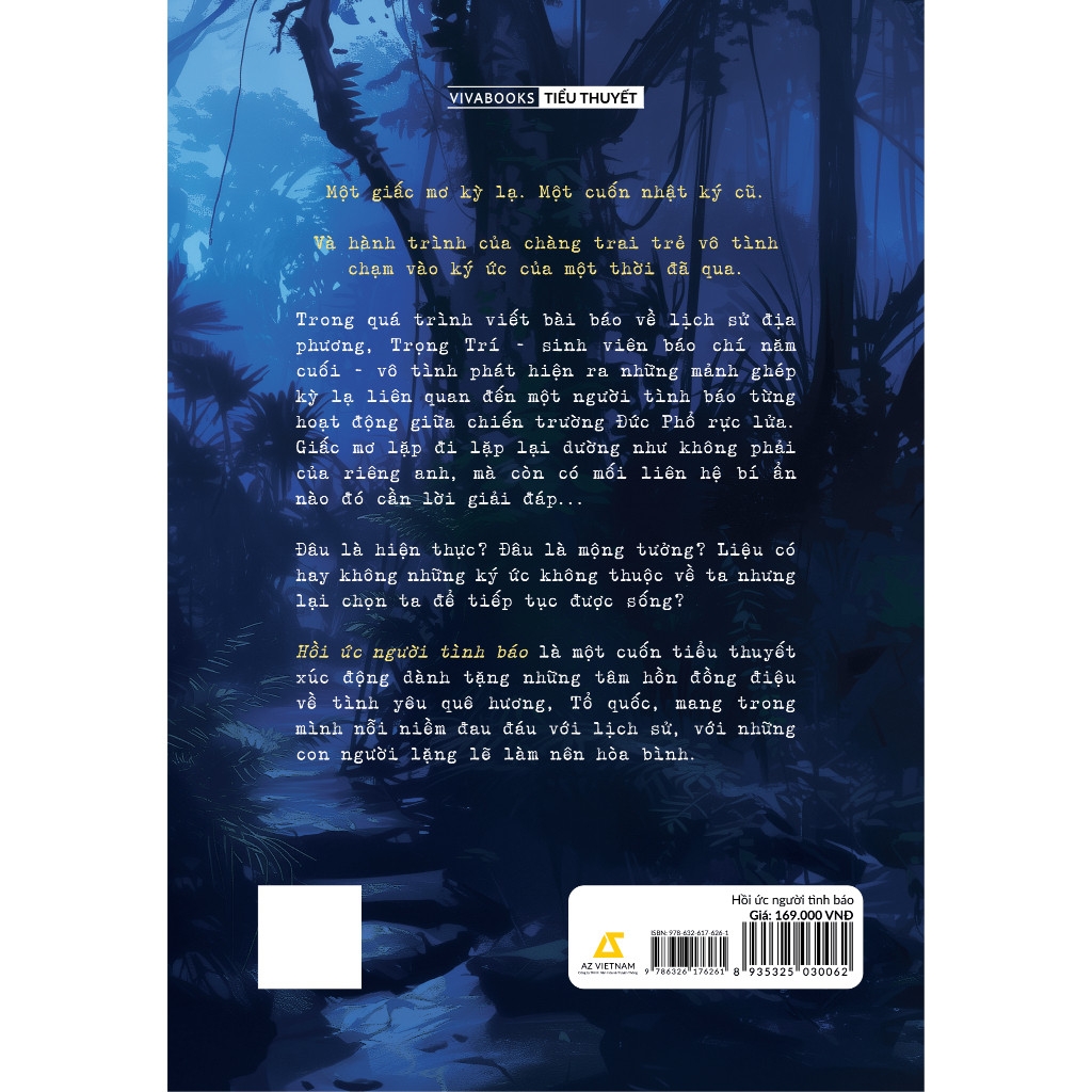 Tác giả: Trí LêKích thước: 14,5x20,5cmSố trang: 432 trangNhà Xuất Bản: Văn họcMột giấc mơ kỳ lạ. Một cuốn nhật ký cũ.Và hành trình của chàng trai trẻ vô tình chạm vào ký ức của một thời đã qua.Trong quá trình viết bài báo về lịch sử địa phương, Trọng Trí - sinh viên báo chí năm cuối - vô tình phát hiện ra những mảnh ghép kỳ lạ liên quan đến một người tình báo từng hoạt động giữa chiến trường Đức Phổ rực lửa. Giấc mơ lặp đi lặp lại dường như không phải của riêng anh, mà còn có mối liên hệ bí ẩn nào đó cần lời giải đáp...Đâu là hiện thực? Đâu là mộng tưởng? Liệu có hay không những ký ức không thuộc về ta nhưng lại chọn ta để tiếp tục được sống?Hồi ức người tình báo là một cuốn tiểu thuyết xúc động dành tặng những tâm hồn đồng điệu về tình yêu quê hương, Tổ quốc, mang trong mình nỗi niềm đau đáu với lịch sử, với những con người lặng lẽ làm nên hòa bình.
