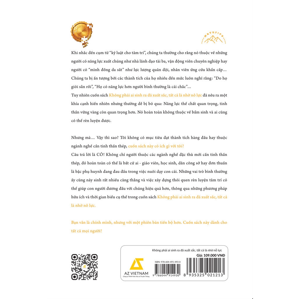 Không Phải Ai Sinh Ra Đã Xuất Sắc, Tất Cả Là Nhờ Nỗ Lực"Quà tặng: 1 bookmark bế khuônTác giả: Eric Potterat và Alan EagleDịch giả: Minh TuấnThể loại: Kỹ năngThương hiệu: Mood Maturity, Mood to ReadCông ty phát hành AZ Việt NamKhổ: 14,5x20,5 cmSố trang: 232 trangNhà Xuất Bản: Văn họcGiá bìa: 109.000 đồngMã công ty: 8935325021213Mã ISBN: 978-604-491-493-0Ngày phát hành: 26/06/2024Loại bìa: Bìa mềmThông báo PH: Không phải ai sinh ra đã xuất sắc,tất cả là nhờ nỗ lựcTác giả: Eric Potterat và Alan EagleSự khác biệt của người thành công với kẻ thất bại không nằm ở sức mạnh, sự hiểu biết, kiến thức, mà làở ý chí.Có rất nhiều người tự hỏi: Tại sao mình có thành tích tốt, cũng không lười nhưng vẫn không đủ xuất sắc?Chỉ có một câu trả lời cho vấn đề này: Bạn vẫn chưa thực sự thay đổi bản thân nhưng lại muốn mình phảithành công, vì thế bạn mãi mãi không thể biết mình có thể xuất sắc như thế nào!Liệu bạn có thể đạt tới sự xuất sắc nhờ rèn luyện?Câu trả lời là CÓ và nỗ lực là điểm mấu chốt của điều này.Nỗ lực là chìa khóa để mở cánh cửa thành công và nó có sức mạnh giúp chúng ta đạt được tiềm năngcao nhất của mình.“Không phải ai sinh ra đã xuất sắc, tất cả là nhờ nỗ lực” là cuốn sách hướng dẫn toàn diện và thiết thựcvề kỷ luật tinh thần để đạt hiệu suất cao do Tiến sĩ Eric Potterat và Alan Eagle chắp bút. Về Eric Potterat, ông là chuyên gia đã phát triển chương trình giảng dạy về độ dẻo dai tinh thần cho lựclượng SEAL của Hải quân Hoa Kỳ. Ngoài ra, ông đã làm việc với hàng nghìn vận động viên hàng đầu nhưđội Los Angeles Dodgers, đội tuyển bóng đá nữ quốc gia Hoa Kỳ, đội Miami Heat, các vận động viên RedBull và hàng chục vận động viên đã giành huy chương Olympic. Bên cạnh đó, ông còn là người tạo nênnhững thành tích xuất sắc cho phi hành gia NASA, quân nhân ưu tú, giám đốc điều hành doanh nghiệp vànhững người ứng cứu khẩn cấp.Về Alan Eagle, ông là tác giả và là huấn luyện viên về truyền thông điều hành, hỗ trợ các nhà lãnh đạo vàdoanh nghiệp định hình cũng như kể câu chuyện của họ. Ông đã làm việc 16 năm tại Google, hợp tác vớicác giám đốc điều hành để truyền tải câu chuyện của doanh nghiệp tới đối tượng khách hàng, đối tác,nhân viên và công chúng.Những ngôi sao, cá nhân xuất sắc này hoạt động trên nhiều lĩnh vực khác nhau, nhưng họ đều có mộtđiểm chung: họ biết cách suy nghĩ rõ ràng và tập trung cao độ trong những hoàn cảnh đầy căng thẳng vàluôn bình tĩnh trước thất bại. Những cá nhân có thành tích hàng đầu thế giới không phải sinh ra đã xuất sắc, họ học hỏi và rèn luyện đểtrở nên ưu tú vượt trội. Tiến sĩ Eric Potterat và Alan Eagle đã dành nhiều năm nghiên cứu phương phápgiúp chúng ta rèn giũa được thói quen huấn luyện tâm trí nhằm đương đầu với khó khăn một cách hiệuquả.Trong cuốn sách, tác giả đã chắt lọc những hiểu biết sâu sắc mà họ đã nghiên cứu thành 5 nguyên tắctinh thần để đạt được hiệu suất cao: Giá trị & Mục tiêu, Tư duy, Quy trình, Sức chống chịu nghịch cảnh vàCân bằng & Phục hồi. Được minh họa bằng nhiều câu chuyện và trích dẫn, cuốn sách nêu bật cácnguyên tắc và phương pháp thực hành rõ ràng, hữu ích mà bất kỳ ai cũng có thể sử dụng để nâng caokhả năng của mình.Tất cả chúng ta đều đã, đang và sẽ là những người xuất sắc nhờ nỗ lực. Đó chính là giá trị mà “Khôngphải ai sinh ra đã xuất sắc, tất cả là nhờ nỗ lực” đem lại.“Bạn vẫn là chính mình nhưng là một phiên bản tiến bộ hơn. Cuốn sách này là dành cho bạn!”Chúc các bạn ngày càng nỗ lực, ngày càng ưu tú!