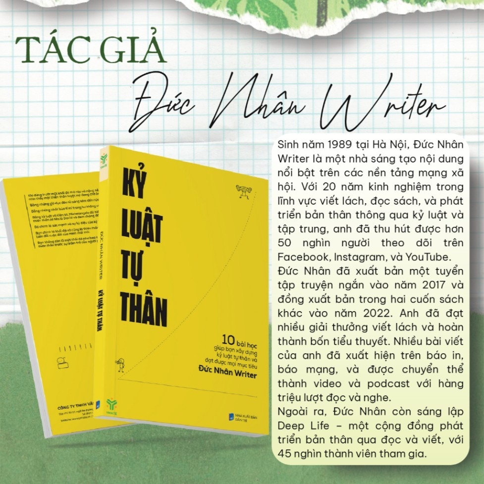 Tác giả không chỉ đơn thuần là một người viết sách, mà còn là một minh chứng sống cho sức mạnh của kỷ luật tự thân. Từ một chàng trai trẻ với xuất phát điểm không mấy thuận lợi, anh đã từng bước vượt qua những giới hạn của bản thân, đạt được thành công trong nhiều lĩnh vực và trở thành nguồn cảm hứng cho hàng ngàn người. Hành trình của anh là một câu chuyện đầy cảm hứng về sự kiên trì, nỗ lực và không ngừng hoàn thiện bản thân.