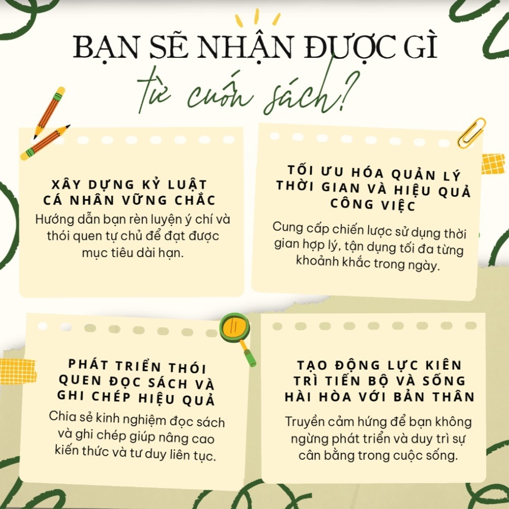 Trong "Kỷ Luật Tự Thân", bạn sẽ được khám phá những bí quyết thực tế và hiệu quả để xây dựng và duy trì kỷ luật cá nhân. Bạn sẽ học cách thiết lập mục tiêu SMART - cụ thể, đo lường được, khả thi, phù hợp và có thời hạn. Bạn sẽ được hướng dẫn cách lập kế hoạch chi tiết, chia nhỏ mục tiêu thành những bước nhỏ dễ thực hiện và theo dõi tiến độ thường xuyên.