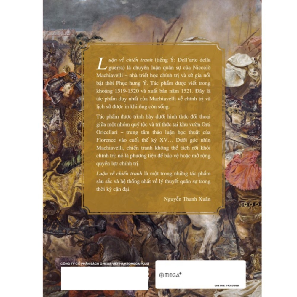 Sách - Luận Về Chiến Tranh - Niccolò Machiavelli (Omega Plus)1. Thông tin sản phẩm:Tác giả: Niccolò MachiavelliNhà phát hành: Omega Plus (AlphaBooks)Ngôn ngữ: Tiếng ViệtNhập khẩu/ trong nước: Trong nướcNăm xuất bản: 2025Số trang: 284Nhà xuất bản: NXB Thế GiớiISBN: 978-632-604-627-4Loại phiên bản: Phiên bản thông thườngLoại nắp: Bìa mềm2. Mô tả sản phẩm:LUẬN VỀ CHIẾN TRANH – NICCOLÒ MACHIAVELLIMột trong những tác phẩm quân sự sâu sắc và có hệ thống nhất của thời kỳ cận đại, “Luận về chiến tranh” là chuyên luận hiếm hoi được Machiavelli xuất bản khi còn sống, phản ánh rõ tư tưởng chính trị – quân sự táo bạo, đầy chiến lược của ông.📖 Nội dung chính:Tác phẩm được trình bày dưới hình thức đối thoại giữa các quý tộc và trí thức Florence tại khu vườn Orti Oricellari – trung tâm học thuật thời Phục hưng. Nhân vật trung tâm Fabrizio Colonna (một condottiere lừng danh) đóng vai trò người truyền đạt tư tưởng của Machiavelli:– Chiến tranh là công cụ không thể tách rời khỏi chính trị– Lãnh đạo khôn ngoan luôn chuẩn bị cho chiến tranh trong thời bình– Phê phán tư tưởng nhân văn chỉ chú trọng nghệ thuật mà xem nhẹ quân sự📚 Giá trị đặc biệt:• Trình bày toàn diện từ tuyển mộ, huấn luyện, tổ chức đến mục tiêu chiến lược của chiến tranh• Khai thác mối quan hệ giữa sức mạnh quân sự và quyền lực chính trị• Là cẩm nang gối đầu giường của nhiều nhà lãnh đạo phương Tây trong thế kỷ XVI• Được dịch sang nhiều ngôn ngữ và tái bản hơn 20 lần chỉ trong một thế kỷ sau khi xuất bản🎯 Dành cho ai?– Người yêu lịch sử phương Tây, chính trị học, lý luận quân sự– Độc giả quan tâm đến Machiavelli và các tư tưởng Phục hưng– Người nghiên cứu chiến lược, lãnh đạo và tư duy quyền lực