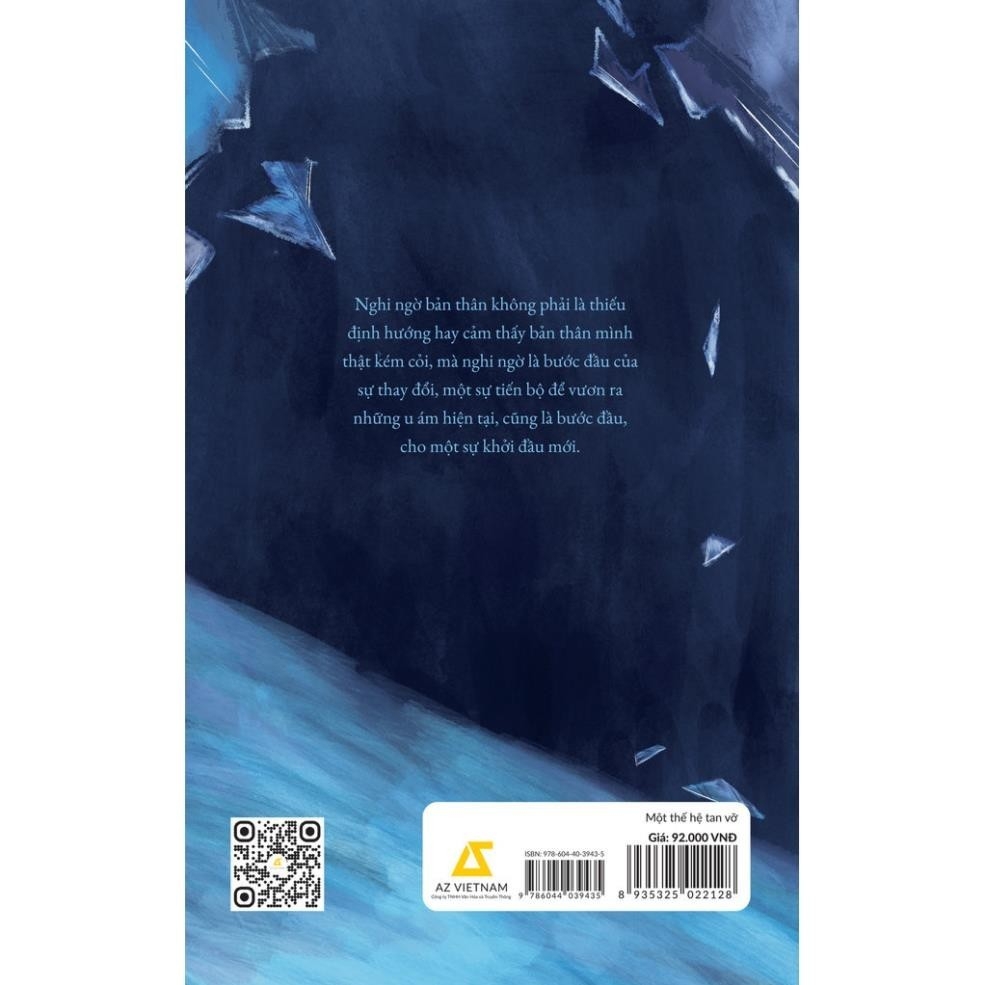 Một Thế Hệ Tan Vỡ"Quà tặng: BookmarkTác giả: Yến NhiThể loại : Sách tản vănThương hiệu: Người Trẻ ViệtCoong ty phast hanfh AZ Việt NamKích thước: 13x20,5 cmSố trang: 200 trangNhà Xuất Bản: Văn HọcGiá bìa: 92.000 VNĐ Mã công ty: 8935325022128Mã ISBN: 978-604-403-943-5Ngày phát hành: 10/08/2024Loại bìa: Bìa mềmCuốn sách này dành tặng cho những người:- “Những người lớn” đang loay hoay hoang mang trong quá trình trưởng thành - Trốn tránh, chèn ép, không dám đối diện với những cảm xúc trong lòng- Bị tổn thương tinh thần, muốn tìm một nơi sưởi ấm, và sự thấu cảm cho tâm hồn Cuộc sống đâu phải lúc nào cũng là một màu hồng và có ai chưa một lần tổn thương? Càng lớn, chúng ta lại càng thấy rõ hơnđiều đó, càng thấy được những áp lực đang dồn nén, những nỗi buồn cứ gặm nhấm mãi chẳng thể nói lên lời. Phải chăng khiấy, điều chúng ta cần nhất đó chính là ở một mình, "tịnh tâm" suy nghĩ về những điều đã qua để biết nên làm gì tiếp theo?Đã từng là một trong những người bị tổn thương về tinh thần, thiếu hụt tình cảm, tác giả Yến Nhi hiểu cảm giác cô đơn lạclõng ở tuổi trẻ là như thế nào, càng hiểu rõ những nỗi đau về tinh thần hơn thể xác gấp vạn lần. Hàng trăm vết xước sâu ở trêntay sau vài ba ngày có thể lành lại, nhưng một vết cứa sắc trong tinh thần lại có thể làm suy sụp cả một đời người. Nếu ví “MỘT THẾ HỆ TAN VỠ” tựa như những bản nhạc, thì có lẽ những bản nhạc này đã bị nhuốm một màu đượm buồn,sẽ có những nốt trầm hoang hoải màu tuyệt vọng, cũng sẽ có những nốt cao thanh thoát phảng phất sự hy vọng xa xăm. Cuốnsách ra đời với mong muốn sẻ chia những hoang mang trong quá trình (mới chớm) trưởng thành, chữa lành những thương tổntới những ai đang cần sự thấu cảm.“Sau một khoảng thời gian đen tối là lúc thực sự bạn trỗi dậy, dù giông bão có lớn đến đâu thì sau cái màn đêm đen kịt ấy, vẫnlà một bầu trời xanh ngắt ngọt lịm. Nỗi tuyệt vọng bạn từng trải qua giúp bạn nhận ra rằng lối đi đến bông hoa đẹp nhất sẽ là utối mịt mờ nhất”.Hy vọng sau khi lật giở 200 trang sách bạn sẽ tìm được hy vọng của chính mình, không vì thất bại mà lạc lối, không vì khókhăn mà sai đường, rằng vẫn còn rất nhiều người yêu thương bạn và cuộc sống này vẫn rất đáng giá.