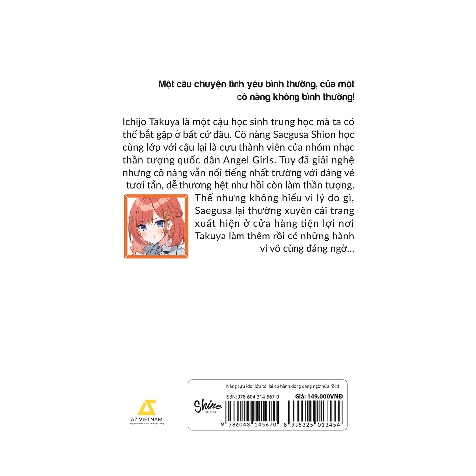Nàng Cựu Idol Lớp Tôi Lại Có Hành Động Đáng Ngờ Nữa Rồi (Tập 1)Tác giả Korin sanMinh họa: KurokiDịch giả Linh BêThể loại Light novelKích thước 13x18cmNhà xuất bản Dân TríThương hiệu ShinebooksGiá bìa 149.000VNĐ Quà tặng : - Bản thường: Tặng 2 Bookmark bế kẹp trong sách- Bản đặc biệt: Tặng 1 Postcard và 1 Poster (Postcard kẹp trong sách, poster để ở ngoài)Mã code 8935325013454 Mã ISBN 978-604-314-567-0 Loại bìa Bìa mềm Số trang 296 trangNgày phát hành 10/7/2023* * *Giới thiệu sách:Một câu chuyện tình yêu bình thường, của một cô nàng không bình thường!Ichijo Takuya là một cậu học sinh trung học mà ta có thể bắt gặp ở bất cứ đâu. Cô nàng Saegusa Shion học cùng lớp với cậu lại là cựu thành viên của nhóm nhạc thần tượng quốc dân Angel Girls. Tuy đã giải nghệ nhưng cô nàng vẫn nổi tiếng nhất trường với dáng vẻ tươi tắn, dễ thương hệt như hồi còn làm thần tượng.Thế nhưng không hiểu vì lý do gì, Saegusa lại thường xuyên cải trang xuất hiện ở cửa hàng tiện lợi nơi Takuya làm thêm rồi có những hành vi vô cùng đáng ngờ… Trích dẫn trong sách:“Không biết lúc nắm tay… cảm giác sẽ như thế nào nhỉ?”“Vậy… Mình thử nắm tay nhau nhé, được không?”