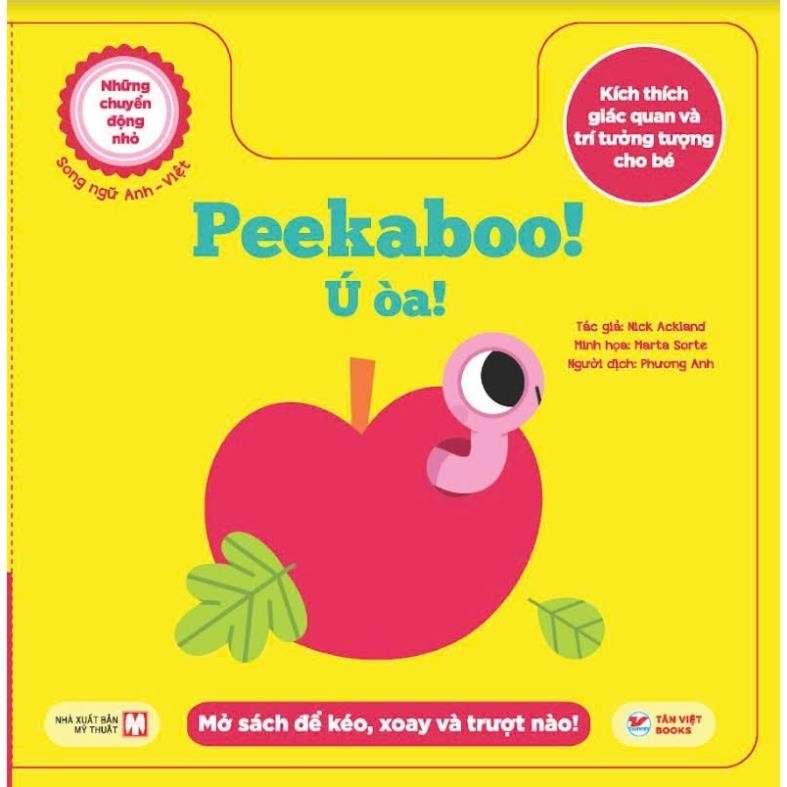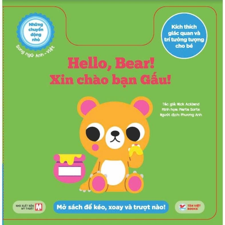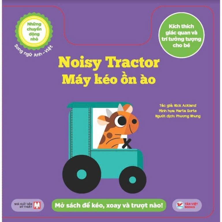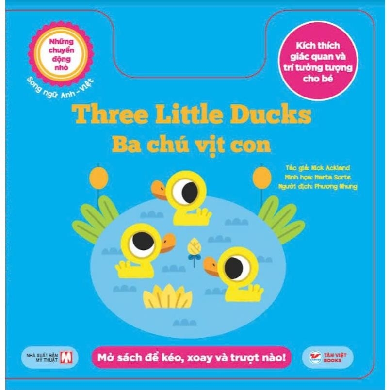TÂN VIỆT BOOKSTCBC GIỚI THIỆU BỘ SÁCH MỚINHỮNG CHUYỂN ĐỘNG NHỎDự kiến phát hành: tháng 9/2024***Những chuyển động nhỏ là bộ sách song ngữ Anh - Việt bao gồm 4 cuốn: Three Little Ducks - Ba chú vịt con Noisy Tractor - Máy kéo ồn ào Peekaboo! - Ú òa! Hello, Bear! - Xin chào bạn Gấu!Đây là 4 cuốn sách vô cùng đáng yêu, ngập tràn màu sắc dành cho các bé từ độ tuổi 0+.Bên cạnh việc được làm quen với những loài động vật thân thuộc, bé còn được hòa mình vàocuộc sống sôi động của chúng thông qua các hoạt động tương tác kéo – xoay – trượt thú vị.Bộ sách song ngữ Anh - Việt này chứa đựng nội dung vô cùng đơn giản nhưng khôngkém phần thu hút sự tò mò của trẻ.Thông qua mỗi trang sách, bé sẽ được gặp gỡ với những loài động vật đáng yêu đanglẩn trốn ở đâu đó, buộc bé phải xoay xở tìm ra chúng bằng cách thực hiện các thao tác kéo vạtgiấy – xoay bánh xe – trượt đẩy miếng ghép.Với thiết kế vừa vặn với bàn tay nhỏ xinh của các bé, bộ sách này không chỉ giúp trẻphát triển các giác quan như quan sát, nhận biết, tìm hiểu về thế giới… mà còn cải thiện kĩnăng vận động tinh và trau dồi vốn từ vựng tiếng Anh của bé thêm phần phong phú.Mỗi trang sách, mỗi hoạt động tương tác sẽ mang đến những điều bất ngờ và thú vịriêng để mỗi giờ đọc sách vừa là khoảng thời gian để bé học tập, vừa là khoảng thời gian đểbé vui chơi cùng cha mẹ.------Thông tin xuất bảnTên bộ: Những chuyển động nhỏ (4 cuốn)Dịch giả: Phương Nhung/Phương AnhSố trang: 10Khổ sách: 17 x 17 cmNăm phát hành: 2024Giá bìa: 95.000 đCode: Three Little Ducks - Ba chú vịt con: 8935210310217 Noisy Tractor - Máy kéo ồn ào: 8935210310224 Peekaboo! - Ú òa!: 8935210310231 Hello, Bear! - Xin chào bạn Gấu!: 8935210310248