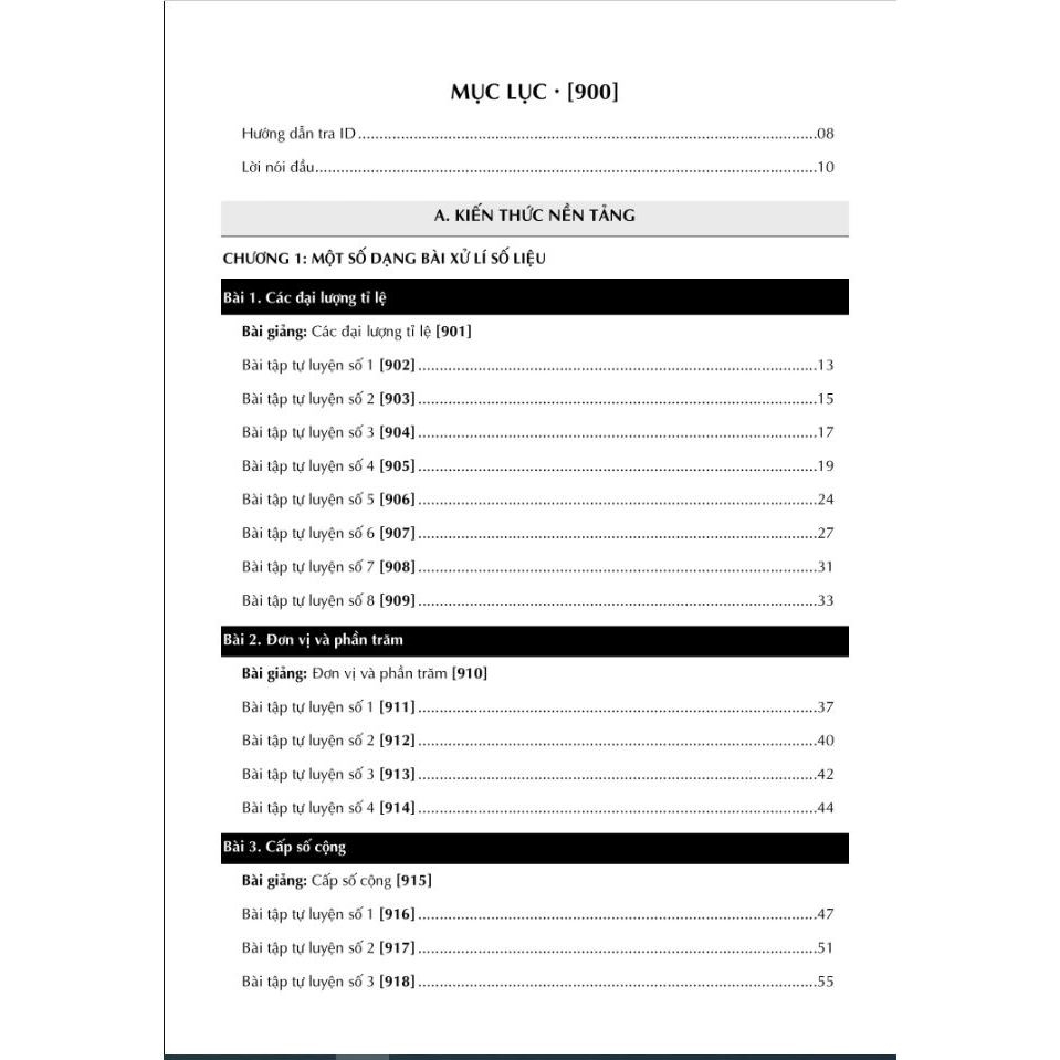 Sách ôn thi Đánh giá năng lực Đại học Quốc gia HCM (V-ACT) - Tổng ôn phần Phân tích số liệu • Hệ thống kiến thức và video bài giảng đầy đủ các dạng bài Tư duy logic;• Cung cấp các phương pháp và kỹ thuật phân tích số liệu tối ưu hệu quả từ cơ bản đến nâng cao.• Bài tập có lời giải chi tiết dạng text kết hợp video theo mã ID.+ Về tổng quan hình thức: Cuốn sách được biên soạn gồm 3 phần; mỗi phần được chia nhỏ thành các chương, mỗi chương được chia nhỏ thành các chủ đề, bài học để bạn đọc dễ tiếp cận. Cuốn sách thiết kế theo định dạng sách ID quen thuộc, bằng cách tra những ID dễ nhớ, dễ gõ, bạn đọc có thể dễ dàng tra cứu bài giảng video, ID đề thi, ID câu hỏi, đáp án và lời giải chi tiết.Đó là những ứng dụng công nghệ hiện đại hỗ trợ tối đa cho việc học tập của bạn đọc khi sở hữu và làm chủ các cuốn sách ID nói chung và cuốn sách này nói riêng.+ Về tổng quan nội dung: đầu tiên, chúng tôi ưu tiên bám sát giải quyết theo đúng ma trận đề thi của kỳ thi ĐGNL ĐHQG TP.HCM công bố. Công việc này không phải là nhiệm vụ quá khó khăn! Điều mà đội ngũ chúng tôi khi biên soạn cuốn sách luôn để tâm đó là kỳ thi ĐGNL TP.HCM không chỉ đánh giá khả năng nắm rõ kiến thức, mà còn chú trọng đến phương pháp và kỹ năng giải quyết vấn đề, theo hướng hiểu – vận dụng – vận dụng cao tiệm cận với các kỳ thi quốc tế, và linh hoạt điều chỉnh để phù hợp với chương trình đào tạo, triết lý giáo dục và yêu cầu đầu vào của các trường đại học tại Việt Nam. Do đó, các câu hỏi, vấn đề được biên soạn trong cuốn sách luôn mang tính đa dạng, phong phú và được phân bốhợp lý đảm bảo tính chặt chẽ và mức độ phù hợp theo định hướng.+ Cụ thể: Phần Phân tích số liệu sẽ trang bị cho các bạn đọc kiến thức về việc thu thập, phân tích và diễn giải dữ liệu. Với sự đa dạng của các loại dữ liệu, từ bảng thống kê, biểu đồ cột, biểu đồ tròn, biểu đồ đoạn thẳng cho đến đồ thị, các bài tập trong cuốn sách sẽ mang đến cho các bạn cái nhìn toàn diện về các loại dữ liệu, giúp bạn chuẩn bị kiến thức một cách toàn diện cho kì thi. Ngoài ra, các bài đọc trong phần này sẽ có số lượng câu hỏi trong một bài nhiều hơn so với đề thi thật nhằm mục đích để các bạn đọc có thể khai thác được hết các khía cạnh, thông tin trong một bài phân tích số liệu, qua đó giúp bạn đọc rèn luyện tư duy, tăng tính phản xạ và tối ưu hóa thời gian làm bài trong bài thi ĐGNL HCM. Hơn nữa, trong thời đại số hóa hiện tại, các bạn đọc không chỉ cần hiểu số liệu, tính toán phần trăm, tỉ lệ các số liệu có sẵn mà cần phân tích, đánh giá, từ đó sử dụng được số liệu để dự đoán, mô phỏng,...các vấn đề cao hơn của số liệu.Cuốn sách này được nhóm tác giả thiết kế các bài tập tự luyện theo độ khó tăng dần qua từng chủ đề. 2. Đối tượng sử dụng:- Học sinh muốn ôn luyện đánh giá năng lực APT Đánh giá năng lực Đại học Quốc gia TP. Hồ Chí Minh - Tài liệu tham khảo cho các thầy cô giáo.