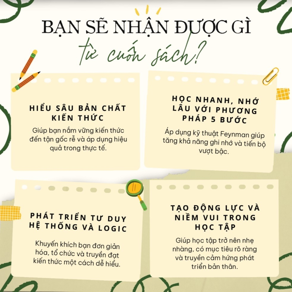 Sách - Phương Pháp Học Tập Feynman - 5 Bước Giúp Bạn Học Nhanh Nhớ Lâu Tiến Bộ Vượt Bậc - - Bạn có đang gặp khó khăn trong việc học tập? - Học nhiều nhưng không nhớ? - Kiến thức không áp dụng được vào thực tế? - Cảm thấy nhàm chán và chán nản với phương pháp học tập truyền thống?Đừng lo lắng! Cuốn sách "Phương Pháp Học Tập Feynman" sẽ là chìa khóa giúp bạn giải quyết mọi vấn đề trên và chinh phục mọi mục tiêu học tập.Phương Pháp Học Tập Feynman là gì? Đây là phương pháp học tập độc đáo được sáng tạo bởi nhà vật lý vĩ đại Richard Feynman. Phương pháp này giúp bạn học tập hiệu quả hơn bằng cách: - Chuyển đổi kiến thức thành ngôn ngữ đơn giản: Giải thích kiến thức một cách dễ hiểu cho người khác giúp bạn hiểu sâu hơn và nhớ lâu hơn. - Tập trung vào ứng dụng thực tế: Phương pháp này hưởng đến việc học để sử dụng, giúp bạn áp dụng kiến thức vào thực tế một cách hiệu quả. - Kích thích tư duy sáng tạo: Quá trình "xuất khẩu" kiến thức thúc đẩy bộ não liên tưởng và sáng tạo, giúp bạn phát triển tư duy độc lập.Cuốn sách "Phương Pháp Học Tập Feynman" dành cho ai? - Học sinh, sinh viên: Giúp các bạn học tập hiệu quả, ghi nhớ kiến thức tốt hơn và đạt kết quả cao trong học tập. - Người đi làm: Giúp các bạn nâng cao năng lực bản thân, học hỏi kiến thức mới và phát triển trong công việc. - Bất kỳ ai muốn cải thiện phương pháp học tập của mình: Cuốn sách cung cấp một phương pháp học tập khoa học và hiệu quả, phù hợp với mọi đối tượng.Nội dung cuốn sách: - Giới thiệu về phương pháp học tập Feynman: Giải thích nguyên tắc hoạt động, lợi ích và cách áp dụng phương pháp. - Hướng dẫn chi tiết từng bước áp dụng phương pháp: Xác định mục tiêu, hiểu rõ kiến thức, xem xét và đơn giản hóa kiến thức. - Ví dụ minh họa: Cuốn sách cung cấp nhiều ví dụ sinh động, giúp bạn dễ dàng hiểu và áp dụng phương pháp vào thực tế. - Lời khuyên hữu ích: Chia sẻ kinh nghiệm và bí quyết học tập hiệu quả từ tác giả và những người áp dụng thành công phương pháp.Cuốn sách "Phương Pháp Học Tập Feynman" là một cẩm nang thiết yếu giúp bạn: - Học tập hiệu quả và nhớ lâu hơn - Áp dụng kiến thức vào thực tế một cách thành công - Kích thích tư duy sáng tạo và phát triển bản thânHãy sở hữu ngay cuốn sách này để bắt đầu hành trình chinh phục kiến thức và thành công!