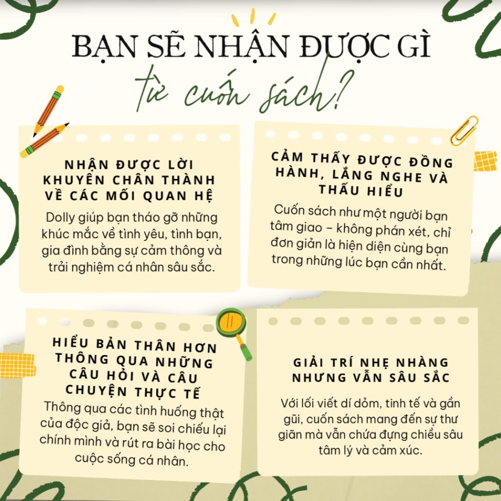 TÂM SỰ VỀ TÌNH YÊU“Tâm sự về tình yêu” là một tác phẩm phi hư cấu tuyệt vời của Dolly Alderton, một nhà văn người Anh tài năng, mở ra một thế giới đa dạng về chủ đề, từ những vấn đề phổ biến như hẹn hò, chia tay, xung đột gia đình cho đến những câu hỏi sâu sắc hơn về sự nghiệp, ước mơ và giá trị bản thân. Qua từng trang sách, tác giả Dolly không ngại chia sẻ những trải nghiệm cá nhân, từ những mối tình dang dở, những cuộc chia tay đau lòng cho đến những khoảnh khắc hạnh phúc và thành công. Chính sự chân thành và cởi mở này đã tạo nên sức hút đặc biệt cho “Tâm sự về tình yêu”.Về tác giả: Dolly Alderton là một nhà văn, nhà báo và người dẫn chương trình podcast người Anh. Cô được biết đến với phong cách viết dí dỏm, chân thực và những quan sát sắc sảo về cuộc sống hiện đại, đặc biệt là về các mối quan hệ, tình yêu và tình bạn.Cuốn sách này dành cho đối tượng:Những người tìm kiếm lời khuyên về các mối quan hệ và cuộc sống: Cuốn sách bao gồm một loạt các chủ đề liên quan đến tình yêu, tình bạn, gia đình, hẹn hò và khám phá bản thân. Nếu bạn đang tìm kiếm sự hướng dẫn hoặc chỉ đơn giản là thích đọc những câu chuyện liên quan đến các chủ đề này, cuốn sách này có thể là một lựa chọn tuyệt vời.Độc giả đánh giá cao các bài luận cá nhân và giai thoại liên quan: Dolly chia sẻ những kinh nghiệm và điểm yếu của chính mình, khiến lời khuyên của cô ấy trở nên chân thực và dễ hiểu hơn. Nếu bạn thích phong cách viết này, bạn có thể sẽ thấy cuốn sách hấp dẫn.LỜI GIỚI THIỆU TRÊN SÁCH: ‘Điều tôi học được khi chia sẻ nỗi đau riêng tư nhất của mình với một người giải quyết vấn đề bán chuyên nghiệp, đó là bản thân việc tìm kiếm sự giúp đỡ đã mang lại sự chữa lành. Cứ như thể tôi đã lén xuống bến tàu trong đêm tối và thả một thông điệp trong chai, tưởng tượng xem nó sẽ được đón nhận như thế nào. Bằng cách viết ra, tôi thừa nhận rằng ai đó có thể quan tâm đến mình; rằng họ có thể nói những điều đúng đắn mà không cần biết tôi là ai. Bởi vì tôi đang cảm nhận những điều mà người khác cũng đã cảm thấy, và do đó, tôi không phải là người phụ nữ cô đơn và kỳ lạ nhất trên thế giới như tôi vẫn nghĩ.'’Từ đầu năm 2020, Dolly Alderton đã chia sẻ sự khôn ngoan, ấm áp và dí dỏm của mình với vô số người đã viết thư cho chuyên mục tư vấn "Dear Dolly" của cô trên tờ The Sunday Times Style. Những câu hỏi của họ trải dài từ những nỗi đau - và đôi khi là những niềm vui - cho đến những điều kỳ quặc. Chúng bao gồm những chia tay và vấn đề về cơ thể, gia đình, tình bạn, hẹn hò, ly hôn, những niềm vui và cạm bẫy của mạng xã hội, tình dục, sự cô đơn, khao khát, tình yêu và mọi thứ ở giữa.Không phán xét, và với sự đồng cảm sâu sắc được đúc kết từ những trải nghiệm của chính mình trong tình yêu, tình bạn và hẹn hò, Dolly dẫn dắt chúng ta qua những mê cung khác nhau của cuộc sống, chứng minh rằng một vấn đề được chia sẻ thực sự là một vấn đề được giải quyết một nửa.