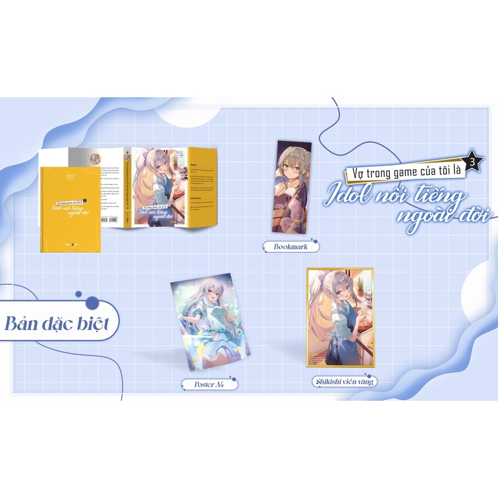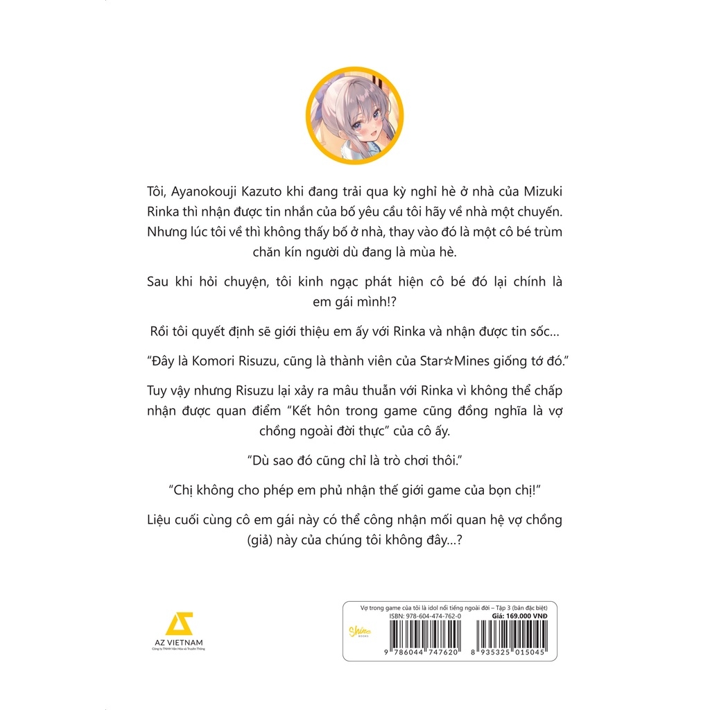 Vợ Trong Game Của Tôi Là Idol Nổi Tiếng Ngoài Đời (Tập 3) "Quà tặng: Bản đặc biệt: - 1 Bookmark kẹp trong sách - 1 Shikishi và 1 Poster size A4 để ở ngoàiBản thường: 1 Bookmark kẹp trong sáchTác giả: Abone Minh họa: kanda doneDịch giả: Ngân NhiThể loại: Light novelKhổ sách: 13x18cmSố trang: 360 trangNhà xuất bản: Dân TríThương hiệu : ShinebooksCông ty phát hành AZ Việt NamGiá bìa : Bản đặc biệt: 169.000VNĐ Bản thường: 139.000VNĐDự kiến phát hành Hà Nội: 13/9 /2023 Sài Gòn: 18/9 /2023Mã ISBN: 978-604-474-762-0 Mã công ty: Bản thường: 8935325015038 Bản đặc biệt: 8935325015045Loại bìa: Bìa mềmGIỚI THIỆU SÁCHTôi, Ayanokouji Kazuto khi đang trải qua kỳ nghỉ hè ở nhà của Mizuki Rinka thìnhận được tin nhắn của bố yêu cầu tôi hãy về nhà một chuyến. Nhưng lúc tôi về thìkhông thấy bố ở nhà, thay vào đó là một cô bé trùm chăn kín người dù đang là mùahè.Sau khi hỏi chuyện, tôi kinh ngạc phát hiện cô bé đó lại chính là em gái mình!?Rồi tôi quyết định sẽ giới thiệu em ấy với Rinka và nhận được tin sốc…“Đây là Komori Risuzu, cũng là thành viên của Star☆Mines giống tớ đó.”Tuy vậy nhưng Risuzu lại xảy ra mâu thuẫn với Rinka vì không thể chấp nhận đượcquan điểm “Kết hôn trong game cũng đồng nghĩa là vợ chồng ngoài đời thực” củacô ấy.“Dù sao đó cũng chỉ là trò chơi thôi.”“Chị không cho phép em phủ nhận thế giới game của bọn chị!”Liệu cuối cùng cô em gái này có thể công nhận mối quan hệ vợ chồng (giả) này củachúng tôi không đây…?Trích dẫn trong sách:“Cảm ơn vì đã tìm thấy tớ nhé, Kazu. Kết hôn với cậu là điều hạnh phúc nhất trongcuộc đời tớ đó.”