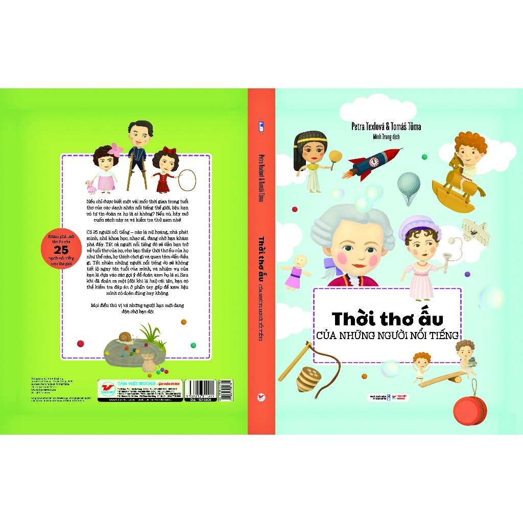 THỜI THƠ ẤU CỦA NHỮNG NGƯỜI NỔI TIẾNGTác giả: Petra Texlová & Tomáš Tůma Dự kiến phát hành: tháng 2/2025 *** Thời thơ ấu của những người nổi tiếng được xem là một cuốn sách, một trò chơi giải trí vô cùng thú vị và lôi cuốn. Đắm chìm trong từng trang sách, bạn đọc sẽ được gặp gỡ với 25 người nổi tiếng – nhưng họ đều ở trong phiên bản thời thơ ấu của mình. Trong số 25 người nổi tiếng này có thể họ là một nhà cai trị quyền lực, một nhà phát minh lỗi lạc, một nhà khoa học uyên bác, một nhạc sĩ tài hoa, hay một tiểu thuyết gia được người người yêu mến…Tất cả những nhân vật này sẽ dẫn bạn quay trở về thời thơ ấu của chính họ và bật mí cho bạn biết cuộc sống ngày bé của họ ra sao, họ thích chơi trò gì và quan tâm đến điều gì nhất – và hẳn nhiên họ sẽ giữ bí mật về tên tuổi của mình đến phút cuối. Mỗi người nổi tiếng đó sẽ đưa ra những gợi ý hữu ích giúp bạn đọc có thể đoán xem họ là ai. Nhiệm vụ của mỗi độc giả chính là thông qua các gợi ý đó để đoán ra được tên người nổi tiếng mà bạn đang đọc.Điều thú vị nhất của cuốn sách này chính là có những trang tay gấp, nơi tiết lộ danh tính hay cũng chính là đáp án để xem liệu bạn đã đoán đúng tên nhân vật mình vừa đọc hay không. Trong trang tay gấp đó, tác giả còn cung cấp thêm nhiều thông tin bổ ích, chẳng hạn như các thành tựu mà người nổi tiếng đó đạt được, giúp bạn đọc được mở rộng vốn hiểu biết và thêm phần ngưỡng mộ, biết ơn những công sức cũng như trí tuệ của họ. Với nội dung thiết thực, hữu ích và hình ảnh minh họa đáng yêu, cuốn sách này đã được dịch ra 13 ngôn ngữ, và được đánh giá cao về lượng kiến thức phù hợp cho mọi lứa tuổi, đặc biệt với lứa tuổi từ 6 đến 8. Tân Việt Books hi vọng rằng với những trang sách màu sắc, thiết kế độc đáo giúp vừa đọc sách trau dồi kiến thức vừa giải trí thư giãn, cuốn sách Thời thơ ấu của những người nổi tiếng sẽ mang lại những giây phút ý nghĩa dành cho mọi người. ------Thông tin xuất bảnTên sách: Thời thơ ấu của những người nổi tiếngTác giả: Petra Texlová & Tomáš TůmaDịch giả: Minh TrangBìa cứng, khổ sách: 21,5 x 28 cmSố trang: 48 trang (có tay gấp)Sách in màu, gia công bìa cứngNăm phát hành: 2025Code: 8935210311511Tân Việt Books giữ bản quyền xuất bản và liên kết NXB Thanh Niên