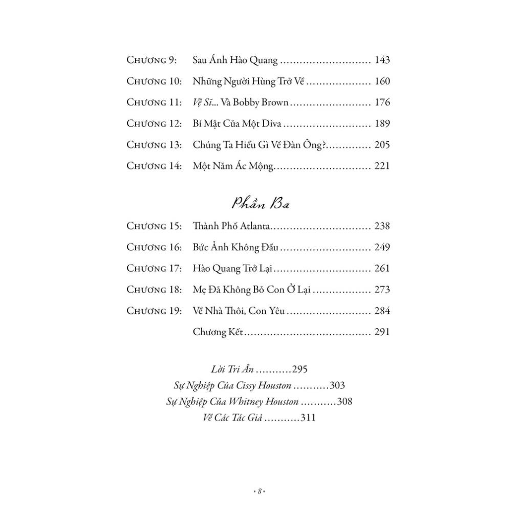 Thông tin xuất bản:Tên sách: Thương nhớ WhitneyTác giả: Cissy Houston và Lisa DickeyCông ty phát hành: Tân Việt Nhà xuất bản: Dân TríKhổ sách: 14.5 x 20.5 cmSố trang: 312 trang và 32 trang phụ lục ảnh màu.Thương Nhớ Whitney là bức chân dung thâm tình, riêng tư và chưa từng được công bố của một trong những nghệ sĩ đáng ngưỡng một nhất trong lịch sử âm nhạc. Tất cả được vẽ nên từ người phụ nữ thương yêu Whitney nhất trên đời – mẹ của cô. Trước thềm lễ trao giải Grammy 2012, giọng ca mạnh mẽ đầy nội lực của Whitney Houston đã vĩnh viễn chìm vào hư không. Suốt nhiều tuần, rồi nhiều tháng sau, gia đình, bạn bè và người hâm mộ Whitney vẫn ngỡ ngàng, không hiểu vì sao tài năng tuyệt vời và tâm hồn thiên thần ấy lại ra đi bất ngờ khi còn quá trẻ. Sự ra đi đột ngột của Whitney không chỉ để lại di sản nghệ thuật sáng chói mà còn bỏ ngỏ nhiều câu hỏi không lời đáp.Nhiều năm sau nỗi mất mát lớn lao đó, bà Cissy Houston - huyền thoại nhạc phúc âm và cũng là mẹ của diva Whitney Houston kể lại một cách toàn vẹn cuộc đời, sự nghiệp của biểu tượng nhạc pop vĩ đại. Câu chuyện khởi nguồn từ những ngày đầu Whitney ca hát trong dàn hợp xướng nhà thờ, cho đến khi cô bước lên đỉnh cao danh vọng trở thành ngôi sao âm nhạc đình đám. Bà Cissy ghi chép lại đầy đủ cuộc hành trình danh vọng của con gái mình và cũng thẳng thắn phơi bày cuộc đời Whitney phía sau ánh đèn sân khấu chói lóa. Đó là cuộc hôn nhân sóng gió với nam ca sĩ Bobby Brown, nỗ lực lấy lại giọng hát nội lực trước sự kì vọng của công chúng và cuộc chiến với ma túy cho đến tận giây phút cuối đời.Qua những trang sách chân thật về những gì Whitney đã trải qua, hầu hết độc giả đều ấn tượng bởi sự kiên nhẫn và tình yêu thương vô điều kiện của bà Cissy với gia đình và con cái. Bên cạnh đó, độc giả cũng sẽ biết thêm về những câu chuyện “hậu trường”, những cảm nhận sâu thẳm của Whitney về danh tiếng. Có thể nhiều độc giả hi vọng họ được biết sự thật về mối quan hệ giữa Whitney với Bobby hay quá trình sa ngã vào chất gây nghiện đến đánh mất bản thân của diva lừng lẫy Whitney Houston, nhưng cuốn sách này không đi sâu mô tả những chi tiết đó. Thay vào đó, bà Cissy tập trung vào khía cạnh cảm xúc và sự nhớ nhung của một người mẹ với đứa con gái bà hết mực thương yêu. Thương nhớ Whitney cũng mang đến cho độc giả bức chân dung một người mẹ bảo bọc con đến mức chính bà Cissy phải thừa nhận rằng đó có thể là lý do khiến Nippy (tên gọi thân mật của Whitney) khó vượt qua được những thử thách của cuộc sống và cũng là một phần lý do khiến con gái bà không tìm đến sự giúp đỡ của mẹ trong các vấn đề cá nhân, từ sảy thai đến cuộc hôn nhân không êm đềm và cuối cùng là nỗ lực vật lộn với ma túy. Tình yêu thương của bà Cissy dành cho Nippy đích thực là thứ tình mẫu tử vô điều kiện nhưng bà lại không biết cách ở bên cạnh con gái mình khi khó khăn và bà cũng chẳng thể tìm ra cách nào khác.Thông tin về tác giả Cissy Houston là ca sĩ chuyên hát nhạc soul và nhạc phúc âm từng đoạt giải Grammy. Bà là mẹ diva quá cố Whitney Houston. Cissy đã thành lập nhóm Sweet Inspirations tạo nên cuộc cách mạng trong nền công nghiệp âm nhạc trong vai trò hát bè cho nhiều nghệ sĩ nổi tiếng như Luther Vandross, Wishbone Ash, Aretha Franklin, Dusty Springfield và Elvis Presley. Bà lớn lên ở Newark, New Jersey cùng gia đình và hiện tại vẫn sống tại đây.