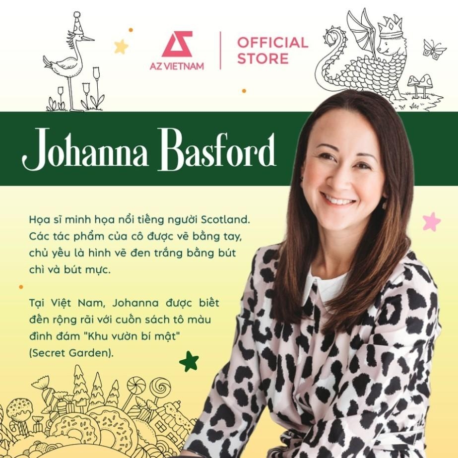 Về tác giả: Johanna Basford là họa sĩ minh họa nổi tiếng người Scotland. Các tác phẩm của cô được vẽ bằng tay, chủ yếu là hình vẽ đen trắng bằng bút chì và bút mực. Tại Việt Nam, Johanna được biết đến rộng rãi với cuốn sách tô màu đình đám "Khu vườn bí mật" (Secret Garden).