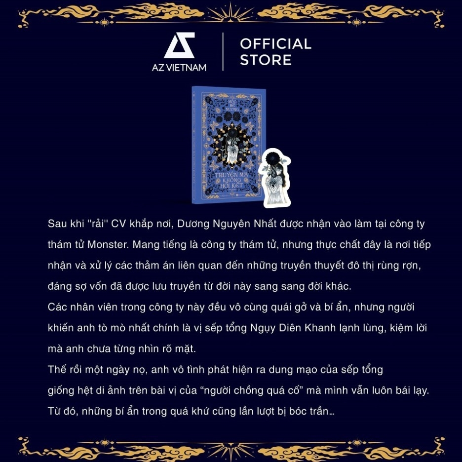 * * *Giới thiệu sách:Sau khi ''rải'' CV khắp nơi, Dương Nguyên Nhất được nhận vào làm tại công ty thám tử Monster. Mang tiếng là công ty thám tử, nhưng thực chất đây là nơi tiếp nhận và xử lý các thảm án liên quan đến những truyền thuyết đô thị rùng rợn, đáng sợ vốn đã được lưu truyền từ đời này sang sang đời khác. Các nhân viên trong công ty này đều vô cùng quái gở và bí ẩn, nhưng người khiến anh tò mò nhất chính là vị sếp tổng Ngụy Diên Khanh lạnh lùng, kiệm lời mà anh chưa từng nhìn rõ mặt. Thế rồi một ngày nọ, anh vô tình phát hiện ra dung mạo của sếp tổng giống hệt di ảnh trên bài vị của “người chồng quá cố” mà mình vẫn luôn bái lạy. Từ đó, những bí ẩn trong quá khứ cũng lần lượt bị bóc trần…#book #sach #Truyenmakhonghoiket #dammy #tieuthuyet #mochenuong