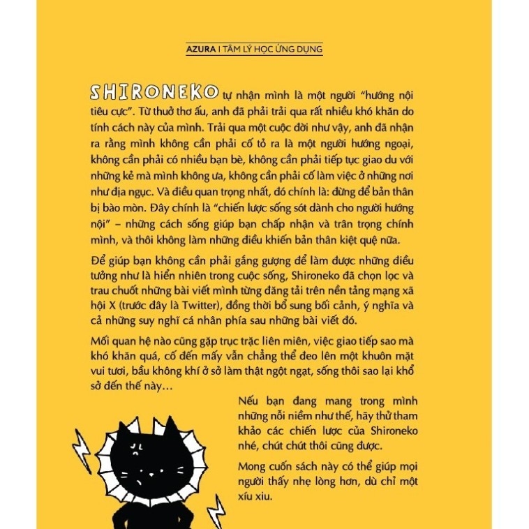 SHIRONEKO tự nhận mình là một người "hướng nội tiêu cực". Từ thuở thơ ấu, anh đã phải trải qua rất nhiều khó khăn do tính cách này của mình. Trải qua một cuộc đời như vậy, anh đã nhận ra rằng mình không cần phải cố tỏ ra là một người hướng ngoại, không cần phải có nhiều bạn bè, không cần phải tiếp tục giao du với những kẻ mà mình không ưa, không cần phải cố làm việc ở những nơi như địa ngục. Và điều quan trọng nhất, đó chính là: đừng để bản thân bị bào mòn. Đây chính là "chiến lược sống sót dành cho người hướng nội" - những cách sống giúp bạn chấp nhận và trân trọng chính mình, và thôi không làm những điều khiến bản thân kiệt quệ nữa.Để giúp bạn không cần phải gắng gượng để làm được những điều tưởng như là hiển nhiên trong cuộc sống, Shironeko đã chọn lọc và trau chuốt những bài viết mình từng đăng tải trên nền tảng mạng xã hội X (trước đây là Twitter), đồng thời bổ sung bối cảnh, ý nghĩa và cả những suy nghĩ cá nhân phía sau những bài viết đó.Mối quan hệ nào cũng gặp trục trặc liên miên, việc giao tiếp sao mà khó khăn quá, cố đến mấy vẫn chẳng thể đeo lên một khuôn mặt vui tươi, bầu không khí ở sở làm thật ngột ngạt, sống thôi sao lại khổ sở đến thế này...Nếu bạn đang mang trong mình những nỗi niềm như thế, hãy thử tham khảo các chiến lược của Shironeko nhé, chút chút thôi cũng được.Mong cuốn sách này có thể giúp mọi người thấy nhẹ lòng hơn, dù chỉ một xíu xiu.