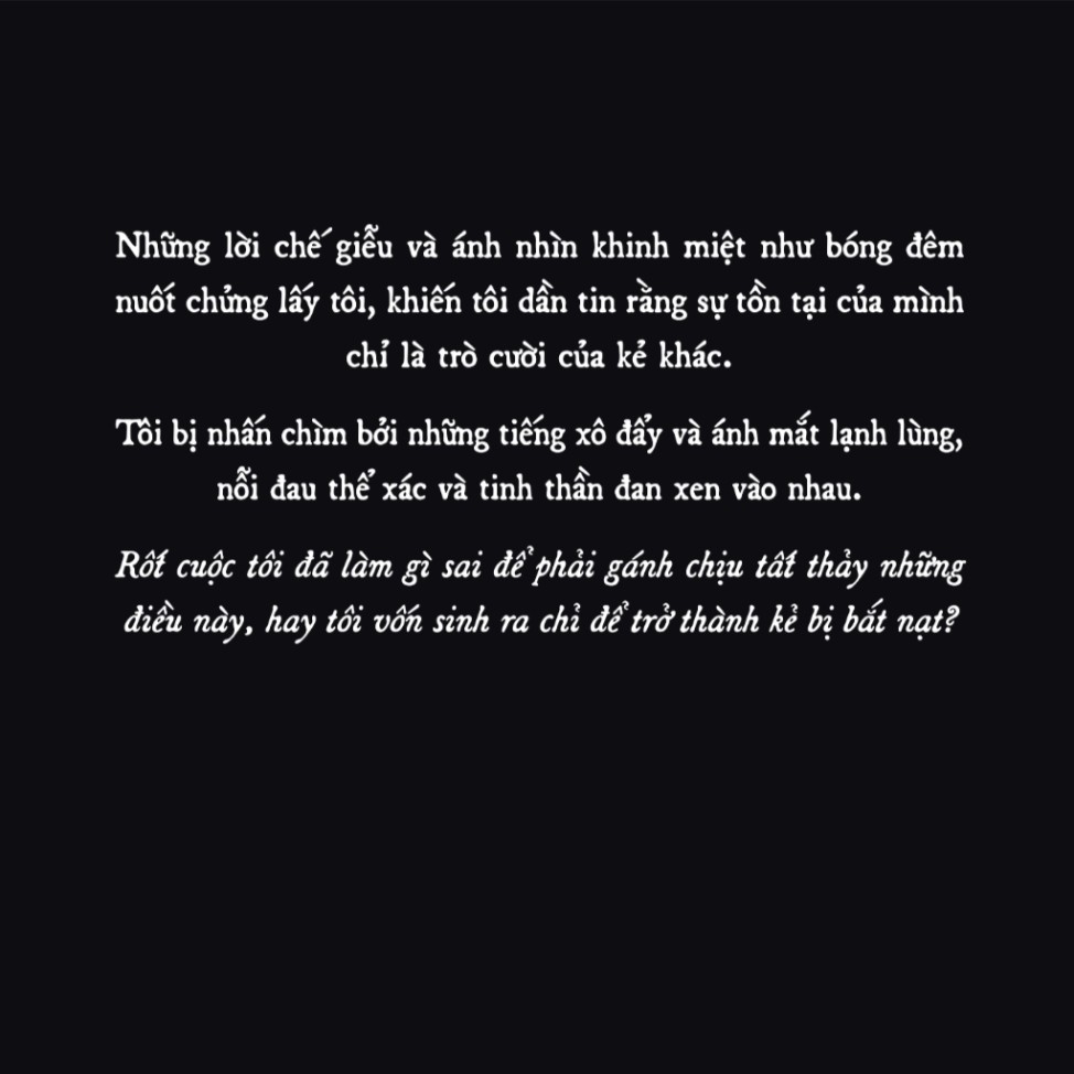 "Không phải tất cả trẻ nhỏ đều ngây thơ"—----------------------“Em không được uống nước, cốc của em bị các bạn tè vào. Đánh em thì em không sợ, nhưng chẳng cho uống nước thì khó chịu lắm ạ.”…Tôi quan sát Châu Tiểu Nghĩa, cậu bé thấp hơn những người bạn cùng tuổi một cái đầu, tôi chợt nhìn thấy một vết bầm tím màu xanh đậm phía dưới vành tai.“Có ai đánh em à?” Tôi ngạc nhiên hỏi.Cậu nhóc lập tức lắc đầu.“Em không nói thật có phải vì sợ tan học Vương Đại Vĩ sẽ đánh em không?” Tôi dò hỏi.Cậu nhóc lại lắc đầu, buột miệng thốt lên: “Các bạn ấy không đánh em, chỉ không cho em uống nước thôi ạ.”“Cái gì cơ?!” Tôi lại thảng thốt: “Ngay cả uống nước cũng không cho à?”“Em không có cốc ạ, có một lần em mang cốc tới thì bị các bạn ấy tè vào cốc.” Châu Tiểu Nghĩa nói lí nhí, “Đánh em thì em không sợ, nhưng chẳng cho uống nước thì khó chịu lắm ạ.”—---------------Bạn có còn nhớ lần cuối cùng mình cảm thấy bị cô lập, bị chế giễu, hay bị xem thường là khi nào không?“Vì sao tôi lại bị bắt nạt?” của tác giả Trần Lam ra đời như một lời thức tỉnh, mở ra góc nhìn mới về bạo lực học đường - thứ “văn hóa ngầm” đang âm thầm hủy hoại tuổi thơ của biết bao người.Tác giả phân tích sâu 4 hình thức bắt nạt trong đời sống hiện đại: từ bạo lực thể chất, bắt nạt bằng tin đồn, bắt nạt qua mạng, cho đến vô tình bắt nạt trực tuyến - những hành vi tưởng nhỏ nhưng có thể khiến một con người sụp đổ.13 câu chuyện có thật trong sách không chỉ là tiếng nói của nạn nhân, mà còn là lời cảnh tỉnh cho cha mẹ, thầy cô và cả xã hội - những người đôi khi làm ngơ trước nỗi đau của con trẻ.