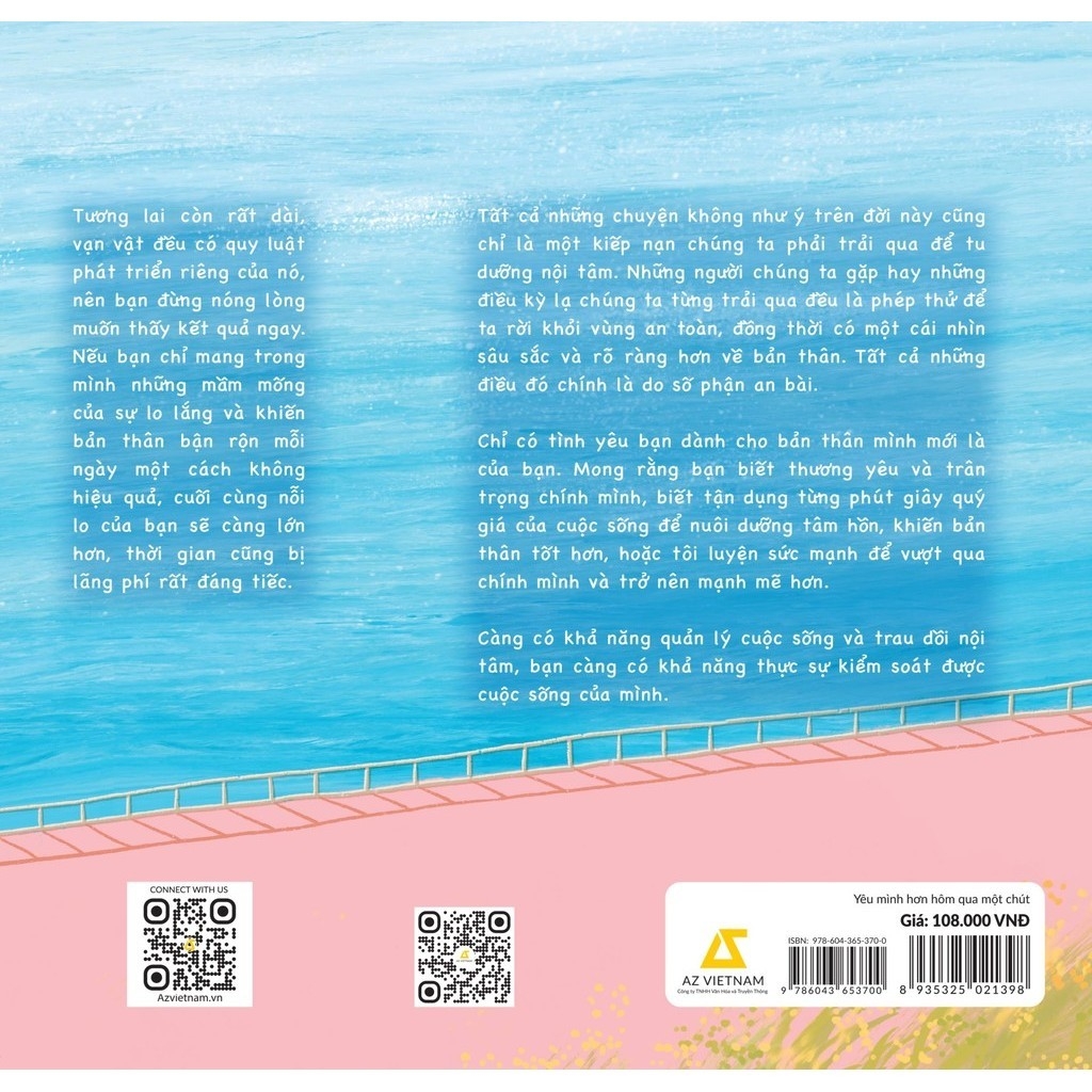 Yêu Mình Hơn Hôm Qua Một Chút"Tác giả: Phạm Tuấn QuyênDịch giả: Tạ Hương GiangThể loại: Truyền cảm hứng chữa lànhThương hiệu: VibooksCông ty phát hành AZ Việt NamKhổ: 14.5x20.5 cmSố trang: 256 trangNhà Xuất Bản: Thế giớiGiá bìa: 108.000 đồngMã công ty: 8935325021398Mã ISBN: 978-604-36-5370-0Ngày phát hành: 26/06/2024Loại bìa: Bìa mềmKhi đứng trước các vấn đề tâm lý chung của con người ta là sợ hãi và muốn bỏchạy. Sẽ có những người dũng cảm đứng lên để đối mặt với vấn đề, từng bước vượtqua khó khăn và biến nó trở thành bàn đạp để bước tiếp. Có những người lặp đi lặplại cùng một sai lầm mà nguyên nhân đằng sau đó là vì không thể chấp nhận và đốimặt với cái bản thân chưa biết. Cũng có những người chọn cách né tránh vấn đề,ngày càng chìm sâu và những lời nói dối và đến cuối cùng vẫn không thể biết đượcvấn đề nằm ở đâu.“Món quà của vũ trụ luôn được gói gọn thành những vấn đề và giao đến tay chúngta, phần còn lại phụ thuộc vào việc chúng ta có đủ năng lượng để xử lý chúng haykhông.”Cơ duyên đã cho chúng ta cơ hội gặp mặt tại đây ngày hôm nay. Và “Yêu mình hơnhôm qua một chút” của tác giả Phạm Tuấn Quyên ở đây là để giúp bạn giải quyếtnhững vấn đề đang khiến bạn đau đầu, khơi dậy sức sống bên trong và phục hồi tâmhồn trở nên trọn vẹn.Có thể ngay lúc này khi cầm cuốn sách trên tay bạn vẫn đang:- Quá chán chường với công việc mình đang làm lúc này, nhưng vẫn phải tự épbản thân thực hiện.- Lúc nào bạn cũng trong trạng thái nhạy cảm, khó chịu, dễ cáu gắt. Bạn luôn quábận tâm người khác nghĩ gì về mình, ngay cả những đánh giá nhỏ cũng khiếnbạn hiểu lầm rằng đối phương đang chỉ trích mình.- Cơ thể bạn dễ mệt mỏi vô cớ, dù thực tế chẳng làm gì nhưng bạn luôn cảm thấyuể oải vô cùng Nhưng mỗi khi nghĩ đến việc nghỉ ngơi, bạn lại bắt đầu tự tráchbản thân, và buộc mình lấy lại tâm thế để trở lại guồng làm việc quay cuồng